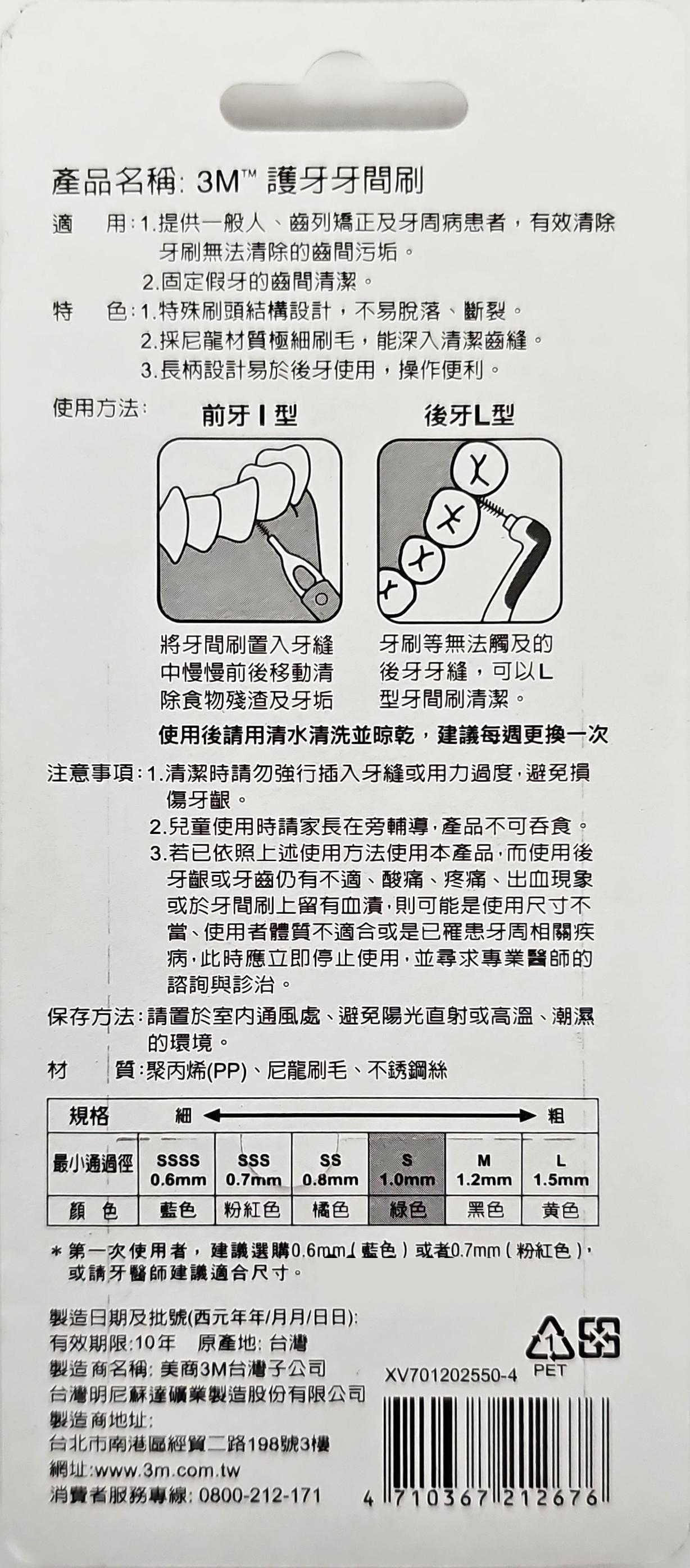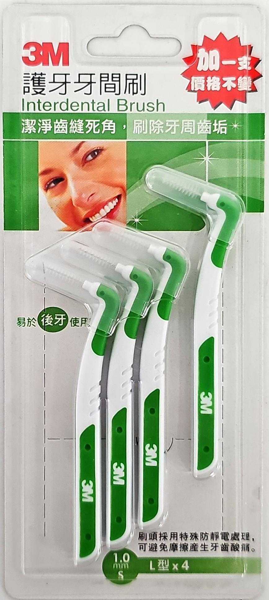 3M護牙牙間刷S(L型4入)採用彎角刷頭設計,能深入清潔後牙牙縫,有效清除牙刷無法觸及的死角污垢。刷毛通過SGS檢驗合格,保證無塑化劑、無重金屬、無甲醛及多環芳香烴(PAHs),讓您安心使用。極細軟毛設計,溫和呵護牙齦,避免刺激。每組包含4支牙間刷,刷毛粗細為1.0mm,適合一般成人使用。定期使用牙間刷,保持口腔健康。