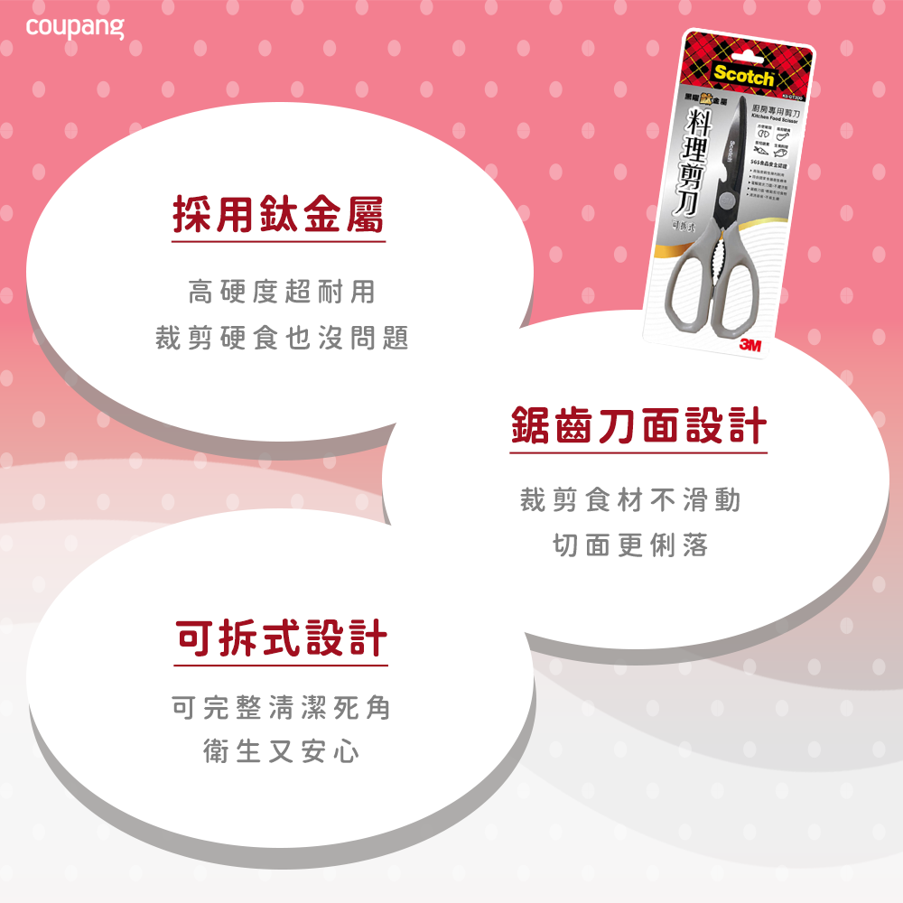 3M Scotch料理專用剪刀KS-DT300,是您廚房裡不可或缺的好幫手。採用鈦金屬材質,刀刃鋒利且耐用,輕鬆處理各種食材,從蔬果到肉類,都能應付自如。獨特的可拆式設計,方便清洗,避免藏污納垢,確保衛生。通過SGS食品安全認證,讓您使用更安心。無論是剪裁肉品、蔬菜,或是開啟瓶罐,這把多功能剪刀都能輕鬆勝任,讓您的料理過程更加順暢。
