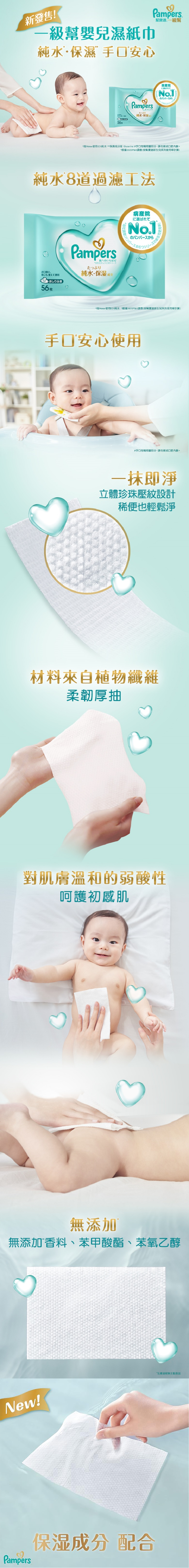 - 幫寶適一級幫濕巾,溫和清潔寶寶嬌嫩的肌膚,讓寶寶隨時保持乾淨舒適。