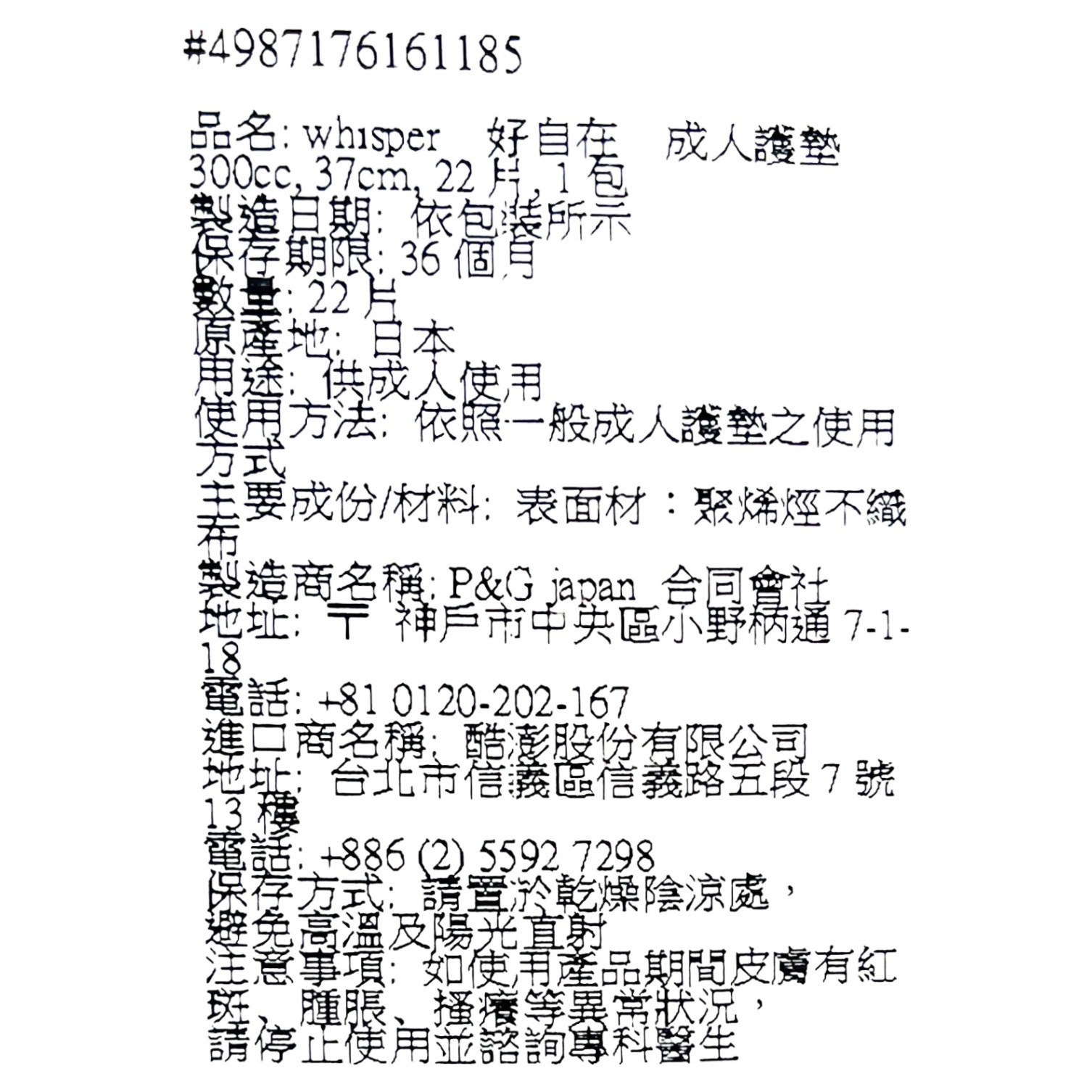 [日本販售同款]whisper 好自在 超吸收成人護墊 成人尿布 300cc,為您帶來安心舒適的體驗。這款37公分的護墊,每包22片,採用聚丙烯不織布材質,觸感柔軟親膚,給您全天候的溫柔呵護。300cc的超強吸收力,讓您告別悶熱潮濕,時刻保持乾爽舒適。無論是日間或夜間,都能安心使用,讓您自信滿滿,享受自在生活。