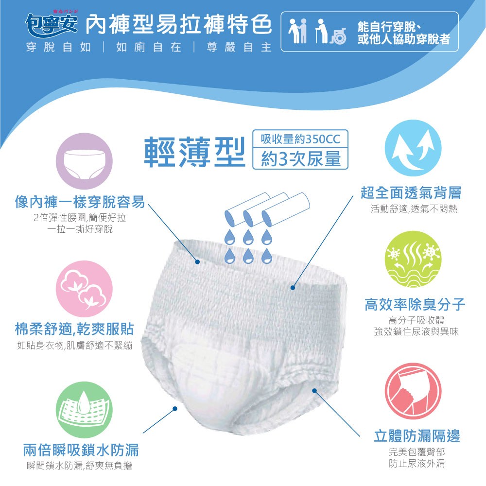 包寧安活力易拉褲,為您提供輕薄舒適的成人紙尿褲體驗。本產品採用棉柔表層,如嬰兒尿布般呵護肌膚,讓您乾爽舒適一整天。活力易拉褲設計如內褲般易於穿脫,360度彈性腰圍貼身舒適,行動自如。每箱包含8包,每包9片M碼易拉褲,男女適用,適合中度尿失禁人士使用。超全面透氣背層,活動舒適,透氣不悶熱,高效除臭分子,強力鎖住尿液與異味,讓您安心無憂。