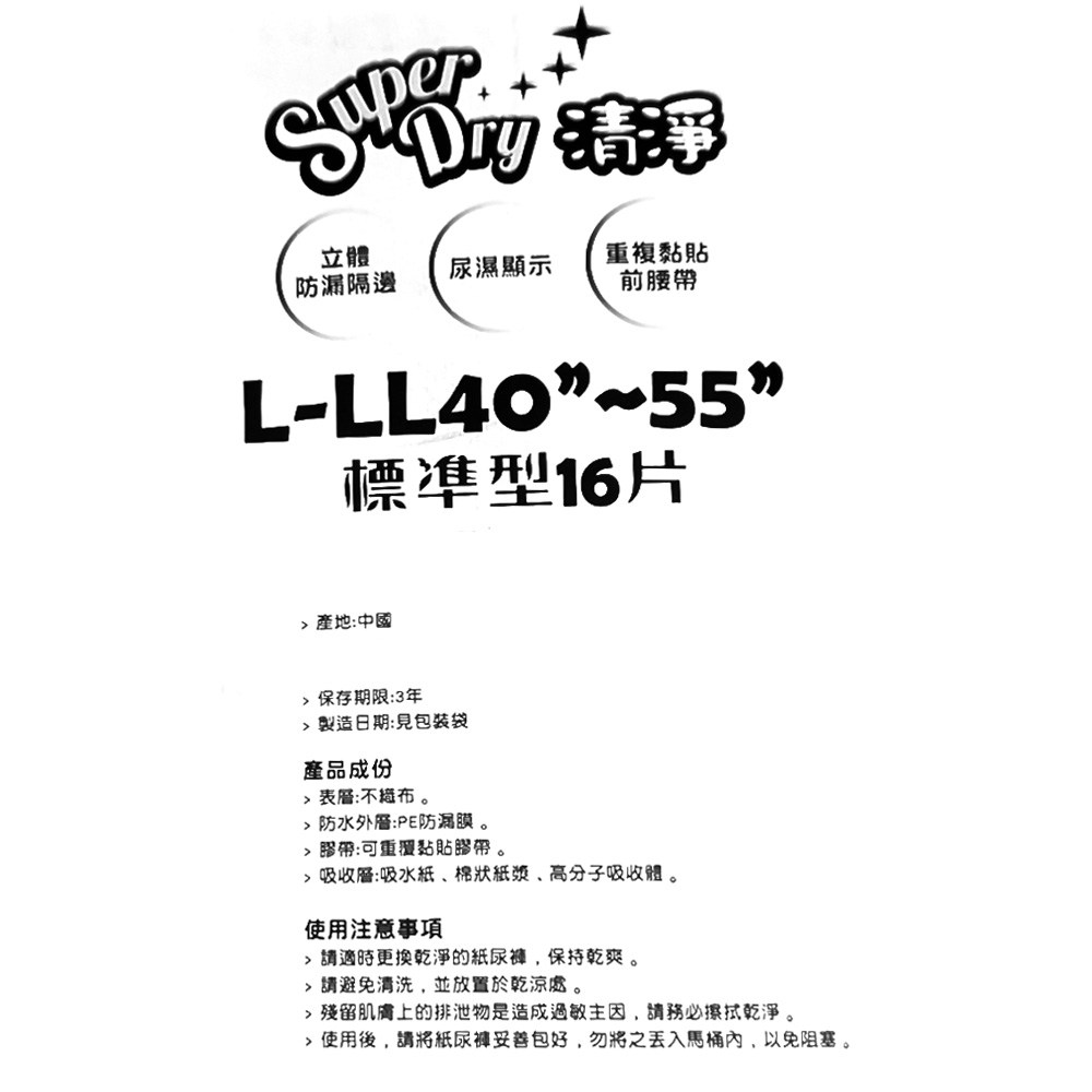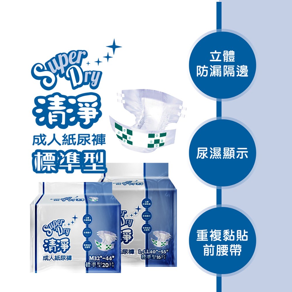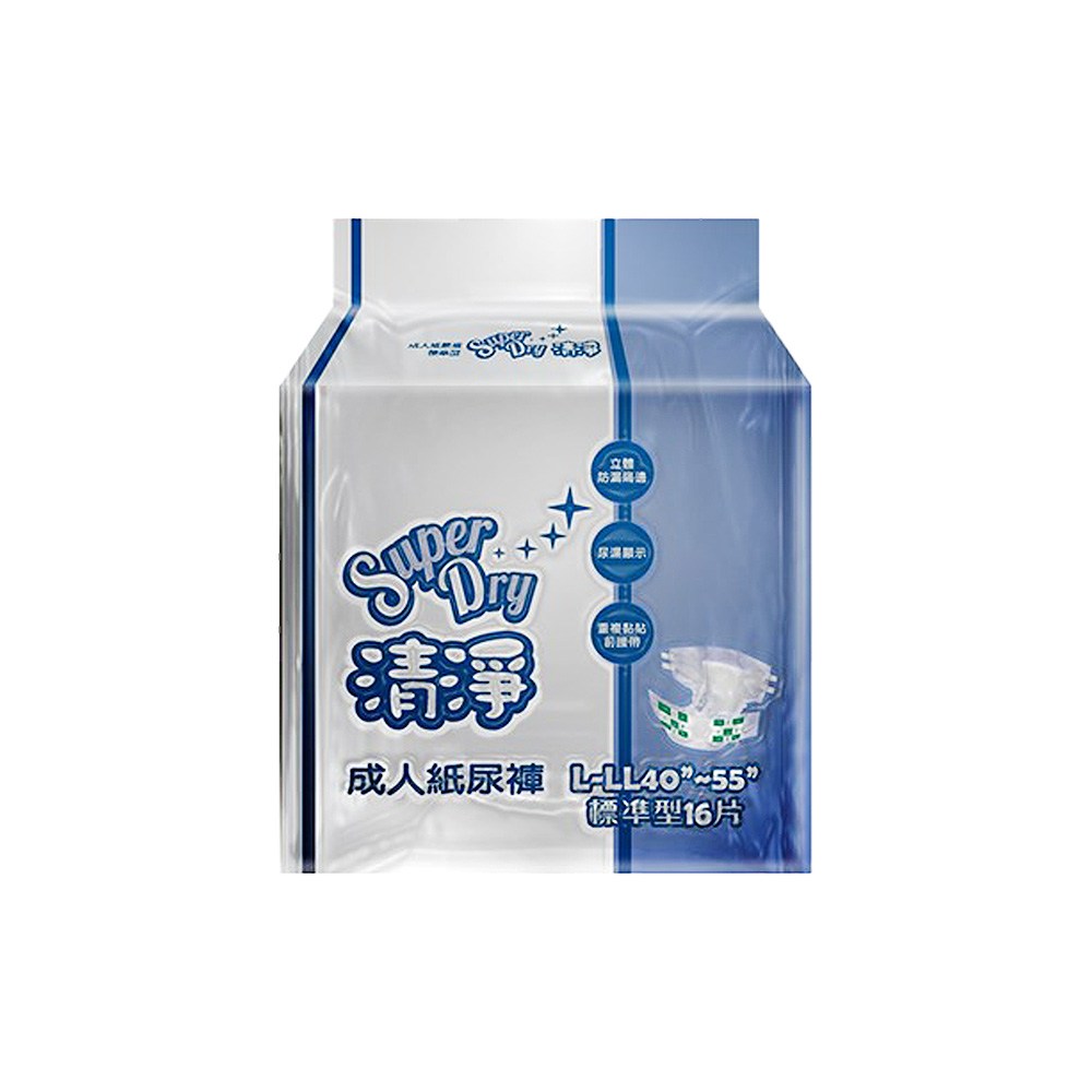 SuperDry 清淨 成人黏貼型紙尿褲,為您提供舒適乾爽的成人護理體驗。L~LL尺寸設計,每包含16片,採用棉、不織布、紙漿、高分子吸收體及聚乙烯薄膜等材質,確保親膚舒適與高效吸收。黏貼型設計方便穿脫,可重複黏貼的前腰帶提供更佳的合身性與舒適度,尿濕顯示提醒您及時更換,保持乾淨衛生。選擇SuperDry,讓您或您的家人享受更安心、舒適的生活。