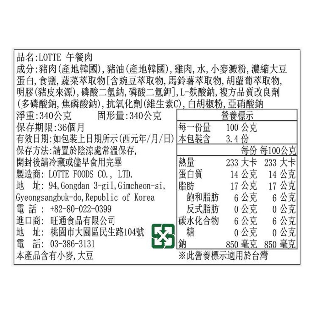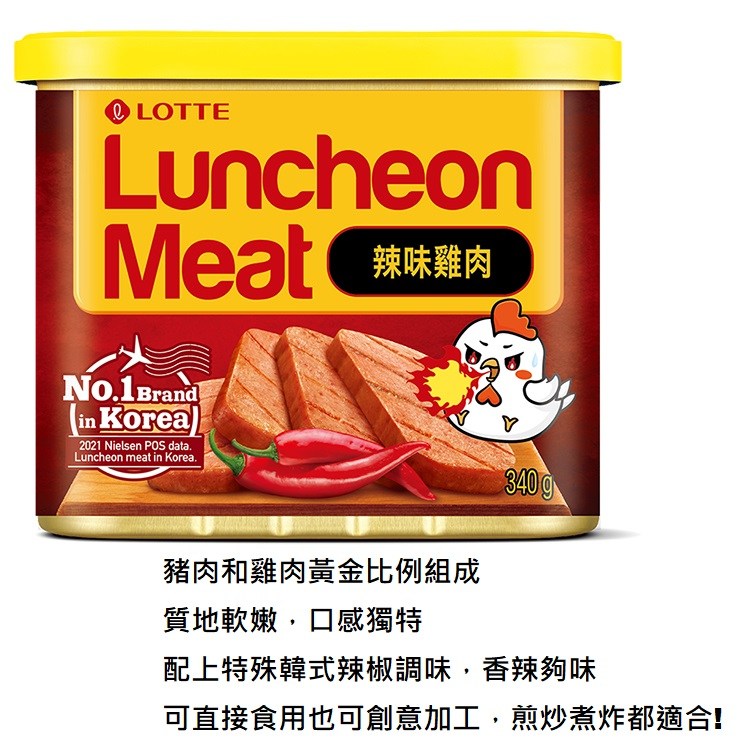 LOTTE 樂天 雞肉午餐肉 (辣味) 是一款風味獨特的罐裝午餐肉,每罐340g,讓您輕鬆享受美味。這款午餐肉以豬肉和雞肉的黃金比例製成,口感軟嫩,搭配特製的韓式辣椒調味,香辣夠味,給您帶來不一樣的味蕾體驗。不論是直接食用,或是創意加工,煎、炒、煮、炸都非常適合,讓您隨時隨地都能享受到美味又方便的佳餚。LOTTE 樂天作為韓國知名品牌,品質值得信賴,讓您安心享用每一口。