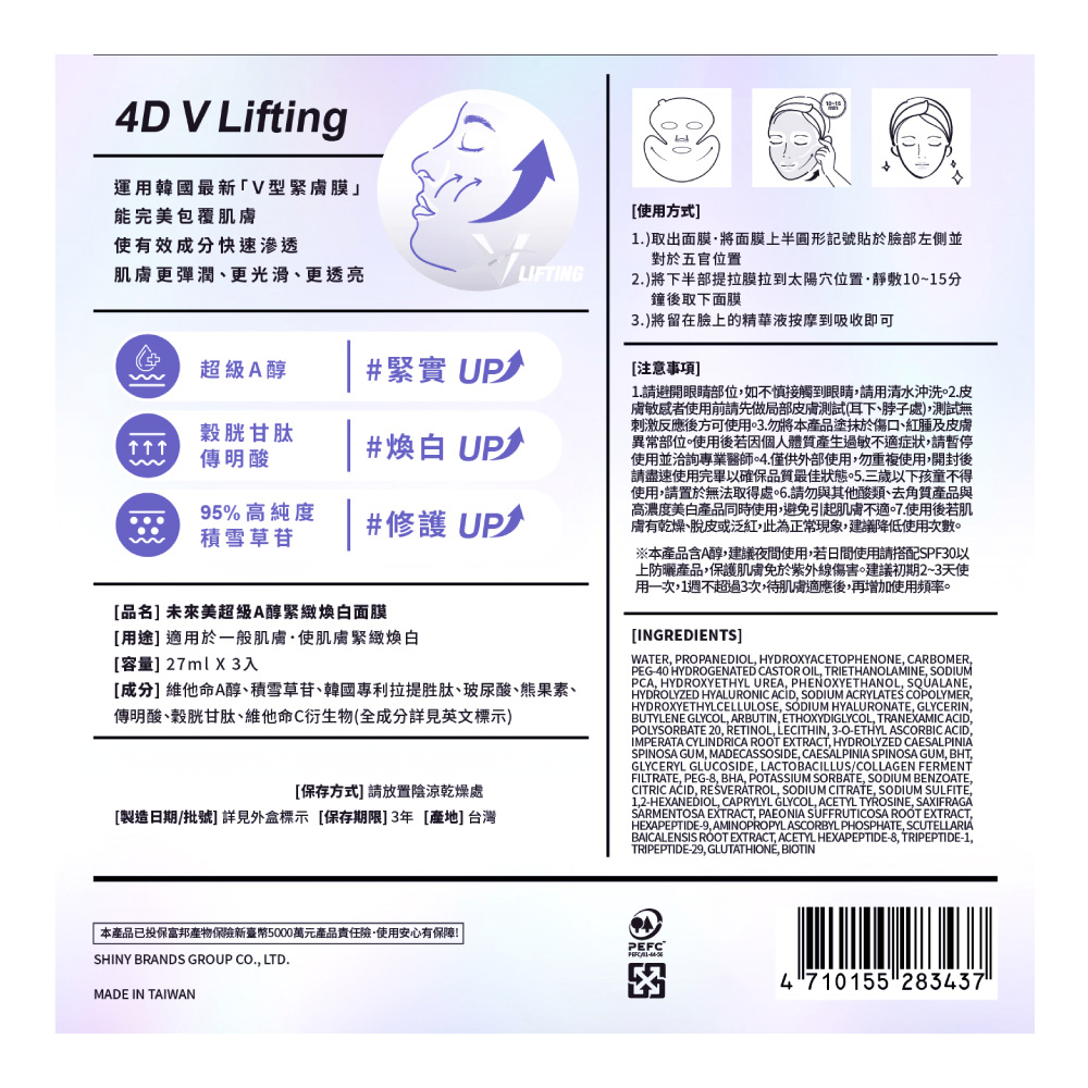 MIRAE 未來美 超級A醇緊緻煥白面膜,蘊含27ml精華,每盒3片裝,為您帶來緊緻亮白的肌膚體驗。這款面膜採用超級A醇配方,能有效延緩肌膚老化,使肌膚緊緻更有彈性。同時,面膜中的煥白成分能改善膚色不均,讓肌膚更加透亮。其獨特的緊膚拉提設計,能完美包覆肌膚,使有效成分快速滲透,讓您在15分鐘內感受肌膚的緊緻與光澤。建議每週使用2-3次,讓您的肌膚持續保持年輕活力。