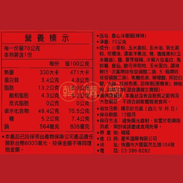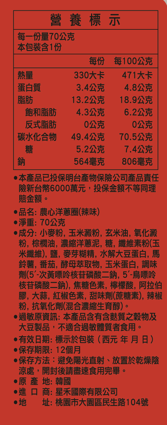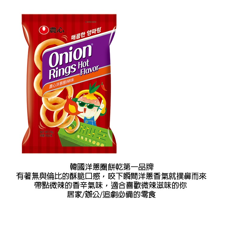 - 農心洋蔥圈辣味,酥脆口感與濃郁洋蔥香氣完美結合,讓您一口接一口,欲罷不能。