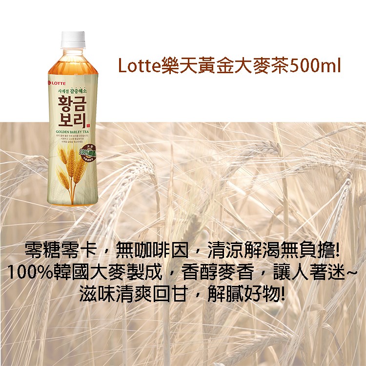 LOTTE 樂天黃金大麥茶,嚴選100%韓國產大麥,以傳統工藝焙炒,散發濃郁麥香,口感清爽回甘,無糖無咖啡因,零負擔。每瓶500ml,適合全家大小隨時享用,冰鎮後風味更佳。無論是佐餐、運動後,或是午後小憩,都能為您帶來清涼解渴的暢快感受。樂天大品牌,品質保證,讓您安心飲用。