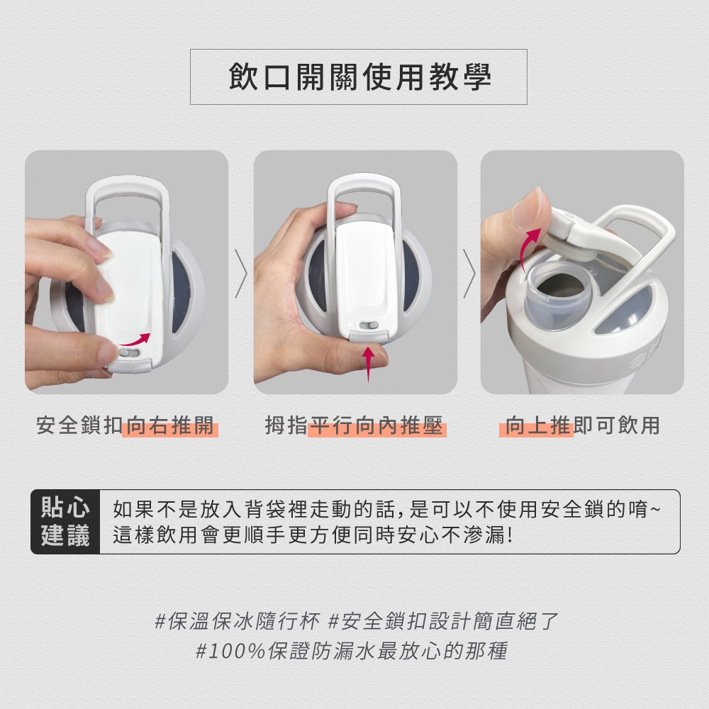 - 按壓式飲口設計,單手操作超方便,運動時也能輕鬆補充水分,隨時隨地享受暢飲。