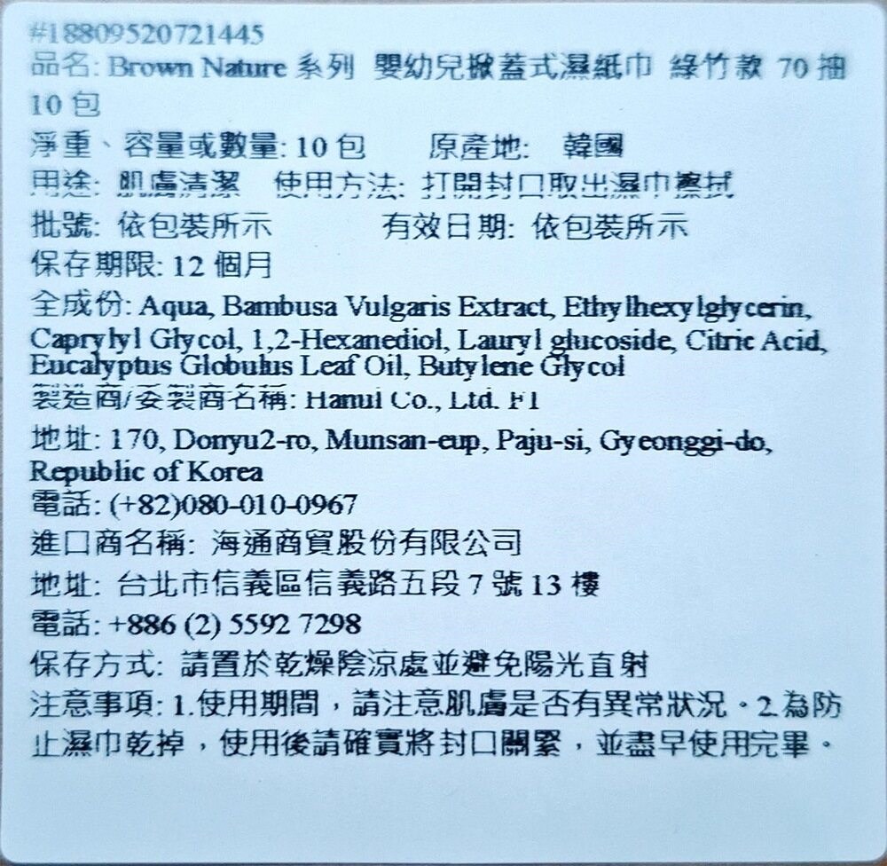 BROWN Nature系列綠竹款嬰幼兒濕紙巾,專為寶寶嬌嫩肌膚設計,給予最溫柔的呵護。添加綠竹萃取精華,能有效保濕並滋潤肌膚,讓寶寶隨時保持清爽舒適。掀蓋式設計方便抽取,單手即可輕鬆使用,隨時隨地保持寶寶清潔。每包含有70張濕紙巾,一組10包,經濟實惠,是媽咪們的最佳選擇。嚴選材質,不含刺激成分,讓寶寶用得安心,媽咪也放心。