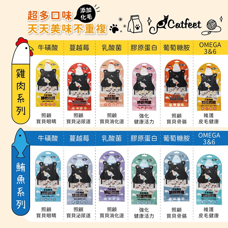 - 美味雞肉搭配羊奶,提供豐富蛋白質,讓貓咪享受美味同時補充營養,活力充沛。