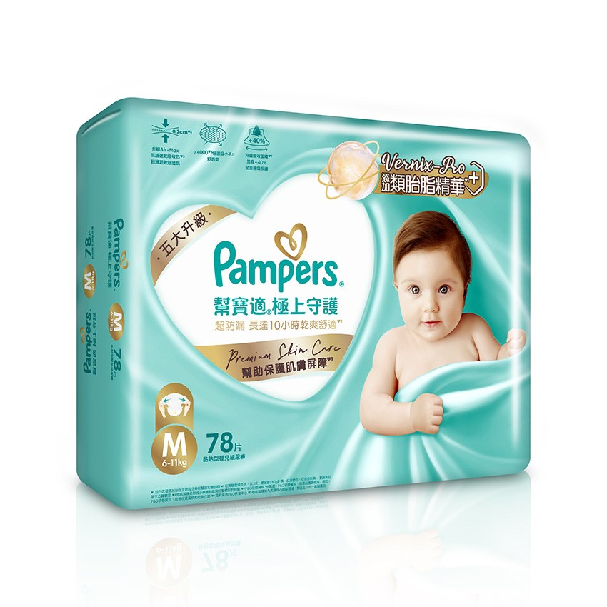 Pampers 幫寶適極上守護黏貼型尿布,台灣公司貨,給寶寶帶來頂級呵護。全新升級,採用柔軟材質,觸感輕柔,呵護寶寶嬌嫩肌膚。獨家Vernix-Pro類胎脂精華,有助於保護寶寶的皮膚屏障,減少刺激。M 尺寸適用於 6~11 公斤的寶寶,一包 156 片,男女寶寶皆適用。超強吸收力,長達 10 小時乾爽舒適,讓寶寶安心睡眠,媽媽更放心。