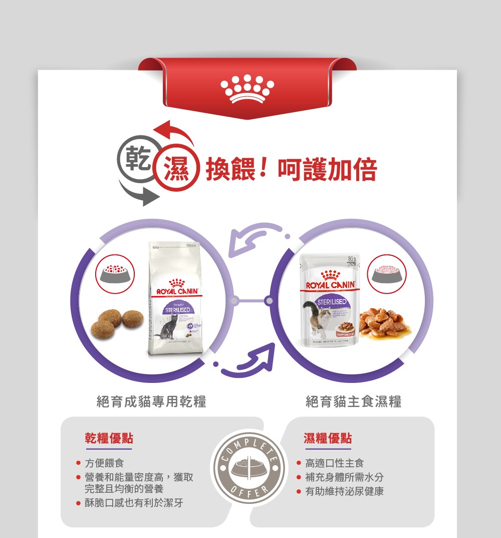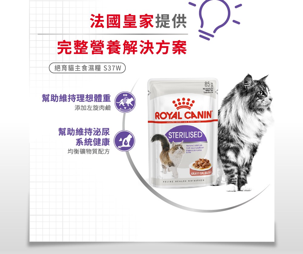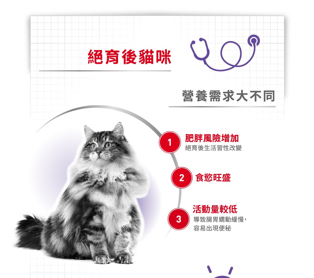- 法國皇家濕糧提供絕佳口感,讓絕育後的貓咪享受美味,促進食慾並確保牠們喜愛每一餐。