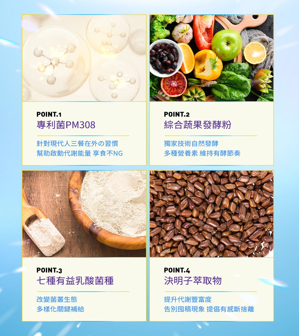 - 專利PM308益生菌,經過科學驗證,能有效調整體質,增強保護力,讓您不再害怕季節變化。