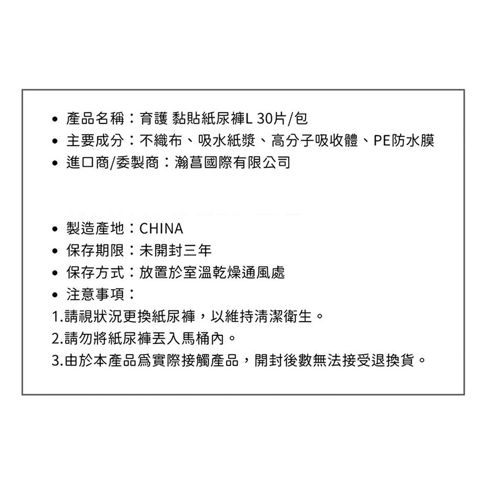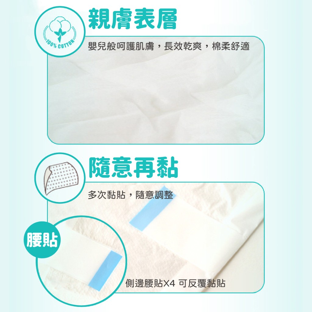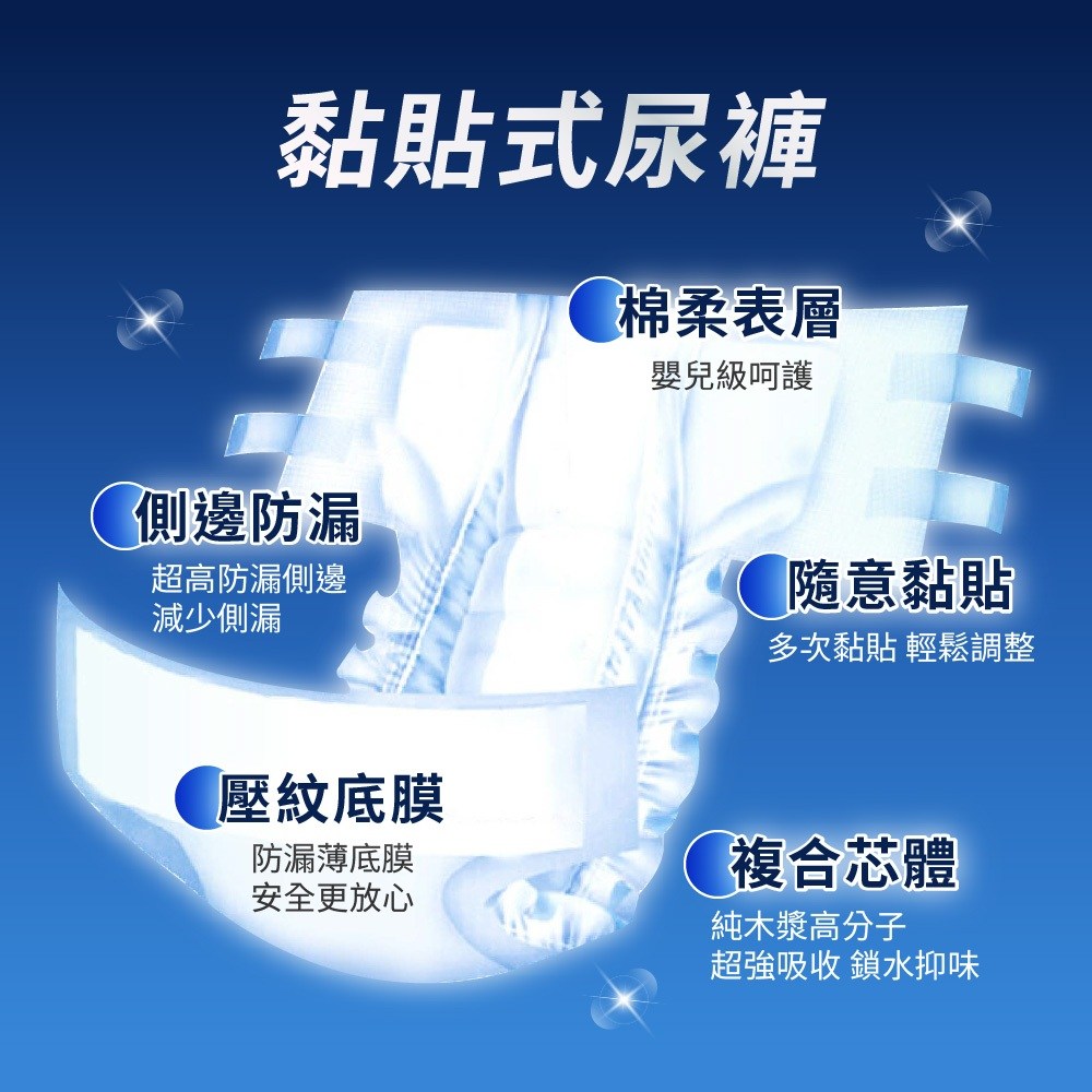 - 育護黏貼型紙尿褲,柔軟材質呵護肌膚,給您舒適乾爽的穿著體驗。