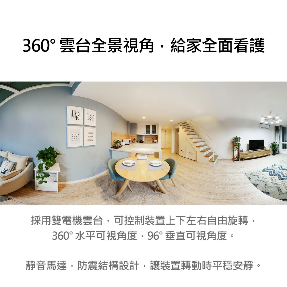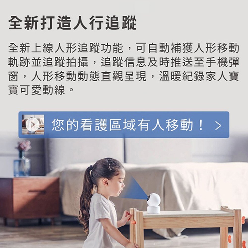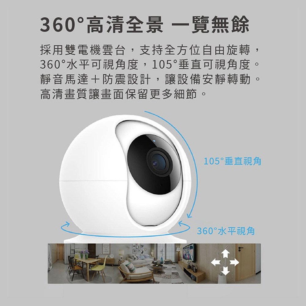 - 透過智慧APP遠端操控,隨時隨地調整攝影機角度,關愛家人、守護寵物更加便捷。