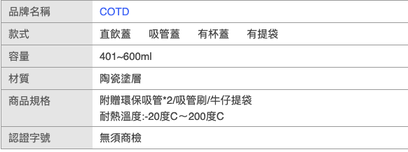 這款COTD陶瓷保溫杯,以簡約奶白色調呈現,容量500ml,是您日常保溫飲品的理想選擇。杯口直徑8cm,杯底直徑6.5cm,高度19cm(含蓋),方便攜帶且易於清潔。陶瓷塗層材質不僅提升了保溫效果,更確保飲品風味純正,無異味殘留。無論是辦公室、戶外活動或居家使用,COTD保溫杯都能讓您隨時享受溫暖或冰涼的飲品,保持最佳狀態,耐熱溫度範圍廣泛,從-20°C至200°C,讓您安心使用。