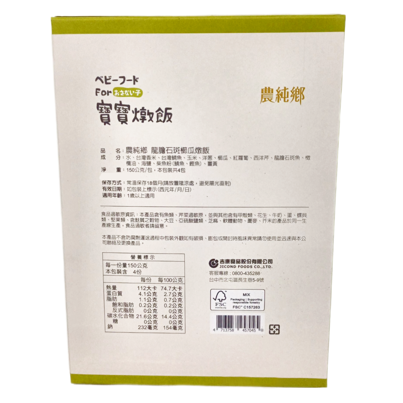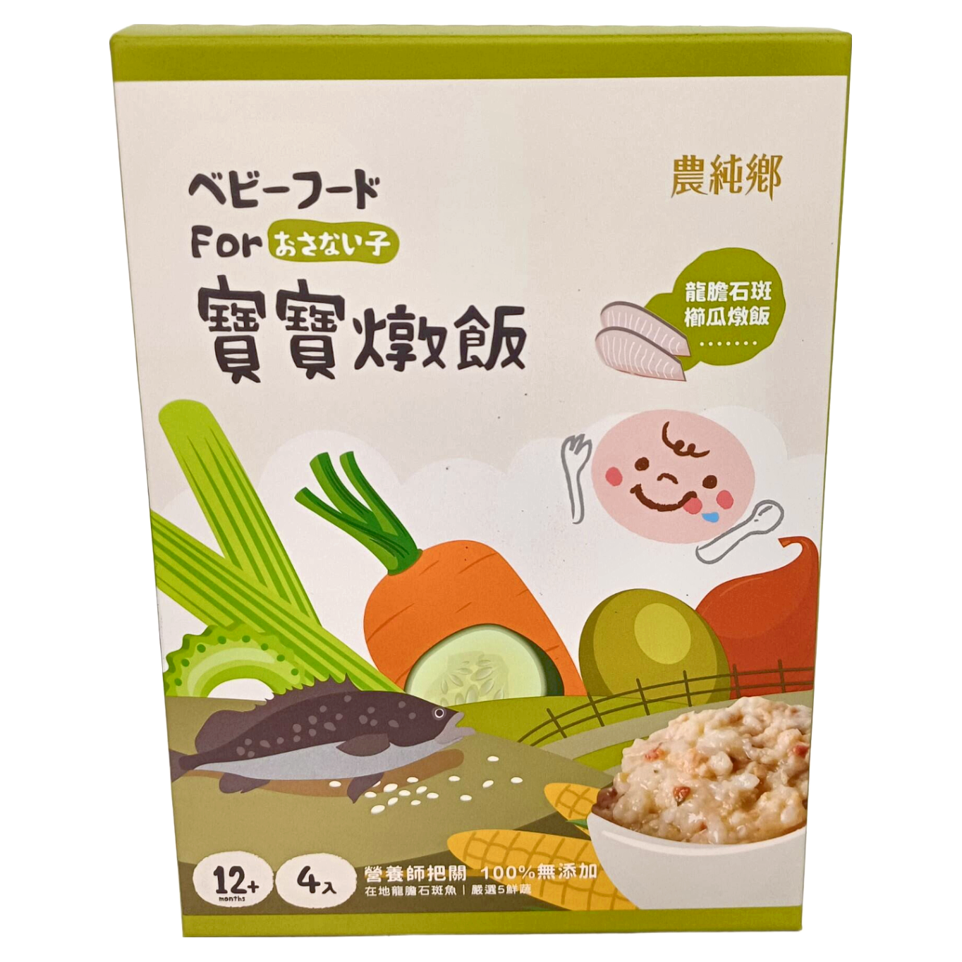 農純鄉龍膽石斑櫛瓜燉飯,為一歲以上寶寶提供美味又營養的餐點選擇。嚴選在地龍膽石斑魚,搭配新鮮櫛瓜等五種蔬菜,由營養師把關,確保寶寶攝取均衡營養。本產品無添加人工色素、香料及防腐劑,讓寶寶吃得安心,媽媽放心。每盒包含四份150克的燉飯,方便忙碌的家長隨時為寶寶準備健康的一餐。簡單加熱即可食用,省時又方便,是寶寶離乳期的理想選擇。