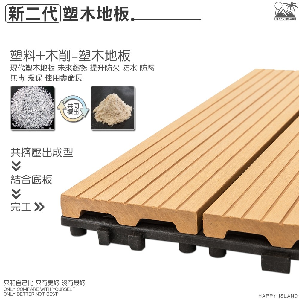 - 直紋設計塑木地板,觸感舒適,赤腳踩踏也很安心,享受自然紋理。
