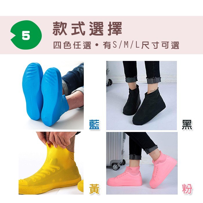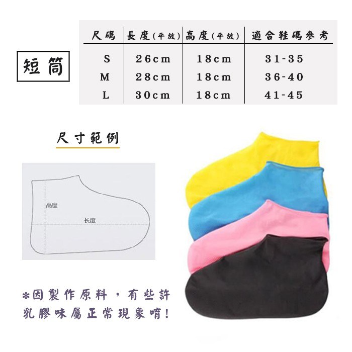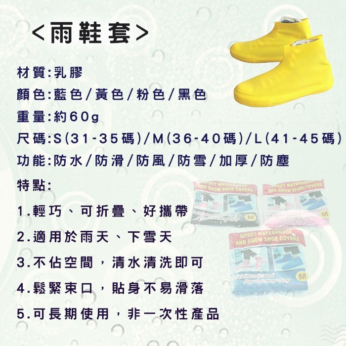 - 乳膠材質鞋套,輕巧易攜帶,隨時保護您的鞋子,避免雨水或泥濘的侵襲,保持鞋面清潔。
