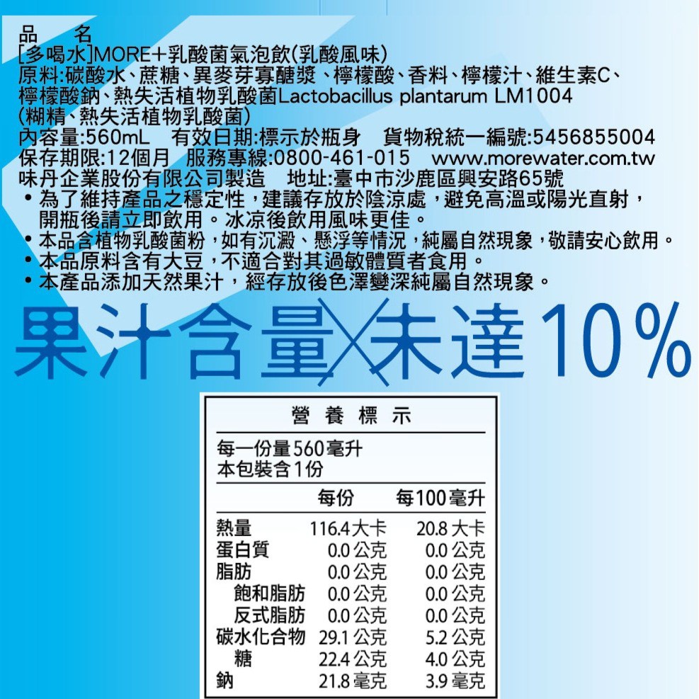 - 多喝水 MORE+系列,口味多樣,乳酸風味清新,氣泡細緻,帶來豐富層次,滿足不同味蕾。