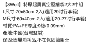 3WELL 特厚超勇真空壓縮袋,採用PA+PE材質,厚度達9絲(0.09mm),堅韌耐用,可重複使用,是您旅行收納的好幫手。這組包含2個中尺寸(60 x 40cm)和2個大尺寸(70 x 50cm)壓縮袋,適用於20-29吋行李箱,能有效壓縮衣物,節省行李箱空間,讓您輕鬆打包,告別凌亂。壓條強力密封設計,確保不漏氣,防潮、防塵、防蟲、無異味,讓您的衣物保持乾淨整潔。真空密封設計,需搭配抽氣幫浦使用,操作簡單,讓您輕鬆享受整潔有序的旅行。