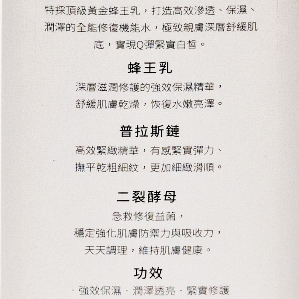- 蘊含豐富蜂王乳精華,為肌膚注入源源不絕的滋養,改善乾燥粗糙,重現水潤光澤。