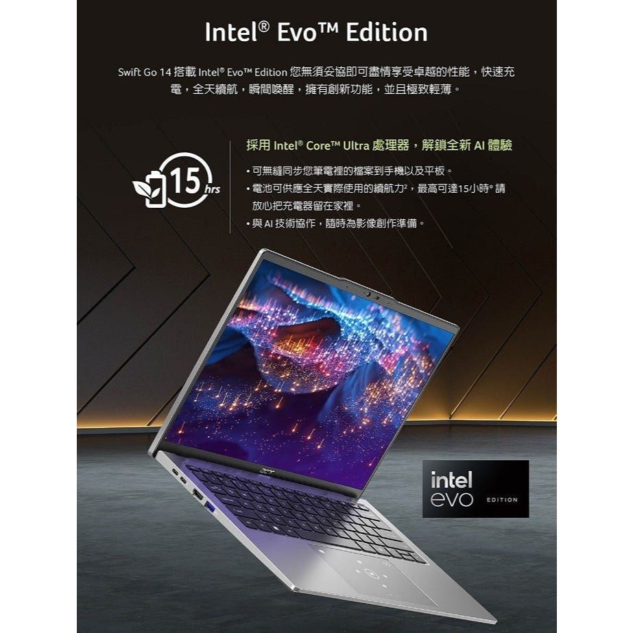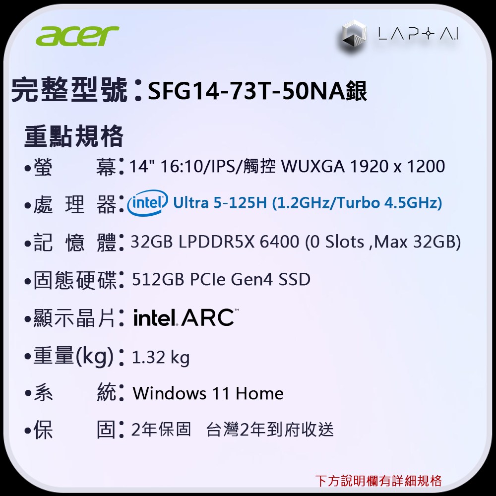 ACER 宏碁Swift GO 輕薄AI筆電,型號SFG14-73T-50NA,以銀色外觀展現時尚品味,搭載Intel Ultra 5 125H處理器和32GB DDR5記憶體,提供卓越的AI運算效能和流暢的多工處理能力。14吋螢幕呈現清晰細膩的畫面,512GB SSD則確保快速的資料存取速度,讓您無論工作或娛樂都能得心應手。預載WIN11作業系統,開箱即可享受便捷的使用體驗。輕薄機身設計,方便攜帶,隨時隨地展現您的專業與效率。