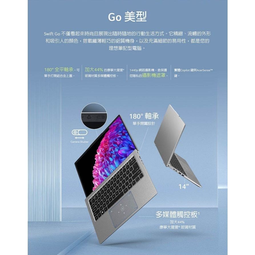 - 宏碁Swift Go筆電,輕巧設計讓您隨時隨地輕鬆工作娛樂,享受極致的便利性。