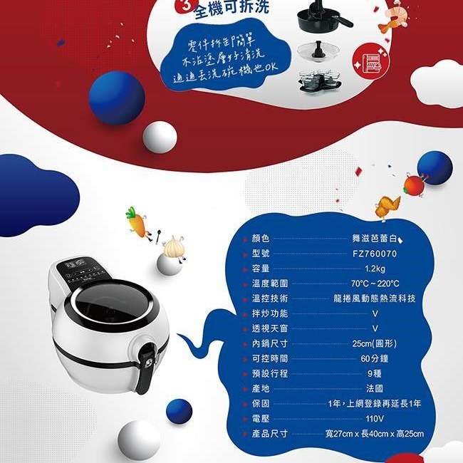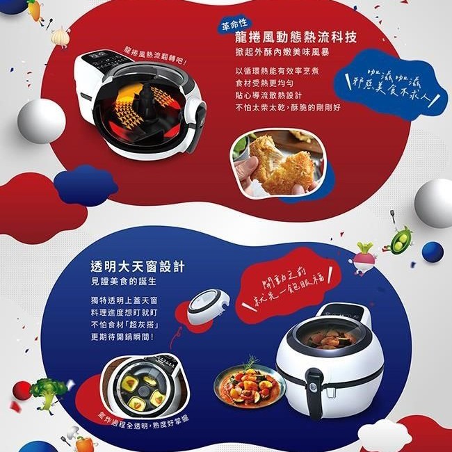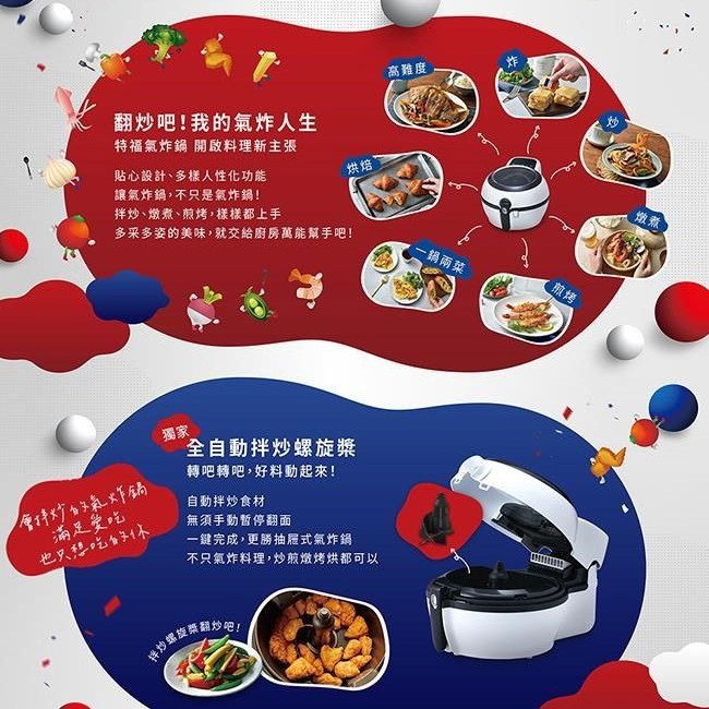 Tefal 特福法國原裝ActiFry胖福鍋氣炸鍋,採用獨特動滋旋風技術,讓食材均勻受熱,口感酥脆。一鍋多用,不僅能氣炸,還能拌炒、燉煮、烘烤,滿足多樣料理需求。透明上蓋設計,烹飪過程一目瞭然,隨時掌握食材的熟度和色澤。法國原裝進口,品質保證,讓您安心享受烹飪的樂趣與美味。內附多道專屬食譜,新手也能輕鬆上手,變身料理達人。