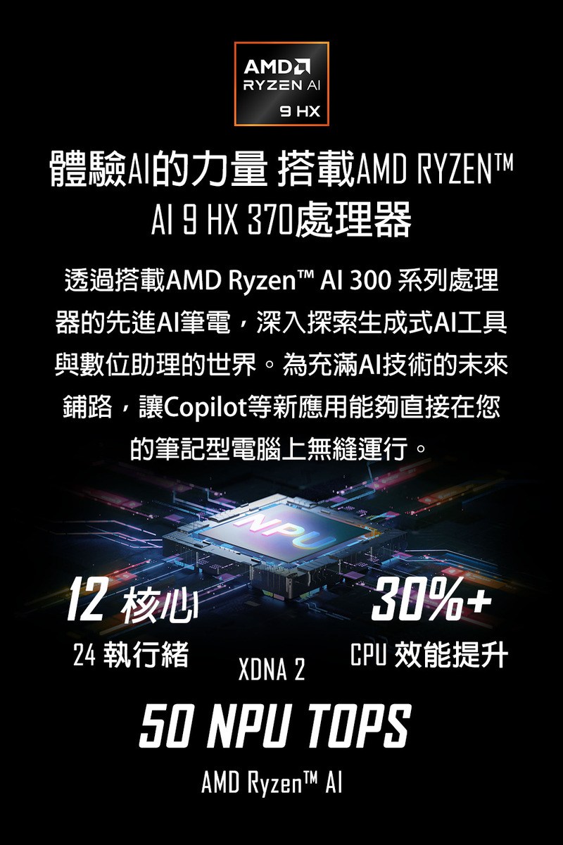 - 搭載 AMD Ryzen™ AI 9 365 處理器