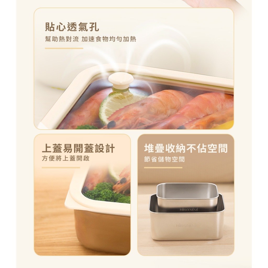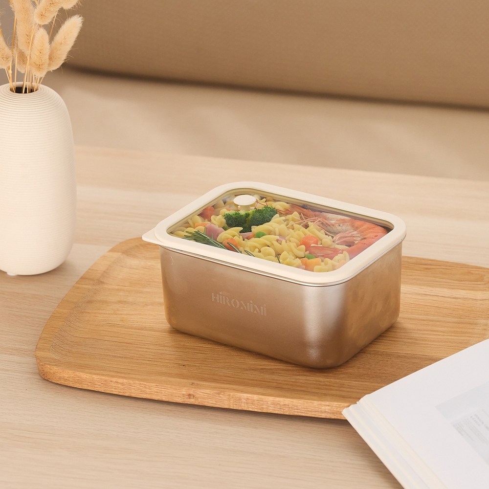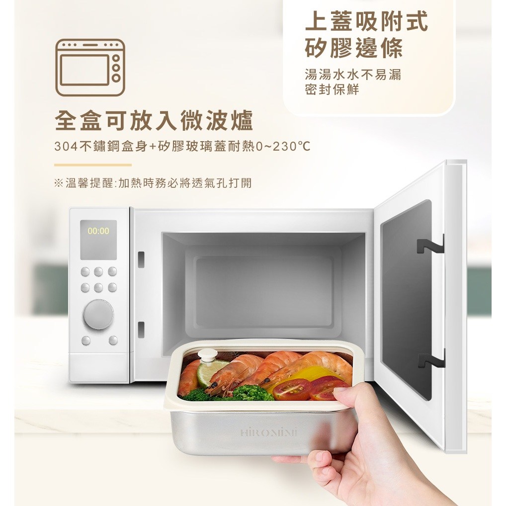 Hiromimi 可微波不鏽鋼保鮮盒,為您提供安全、便利的食物儲存方案。這款1公升容量的保鮮盒採用304不鏽鋼材質,堅固耐用且通過SGS檢測,讓您安心使用。其獨特的可微波設計,讓您無需更換容器即可輕鬆加熱食物,節省時間與精力。矽膠邊框的玻璃上蓋緊密貼合,保持食物新鮮。盒身一體成型,易於清洗,不易藏污納垢,是您健康飲食生活的好幫手。