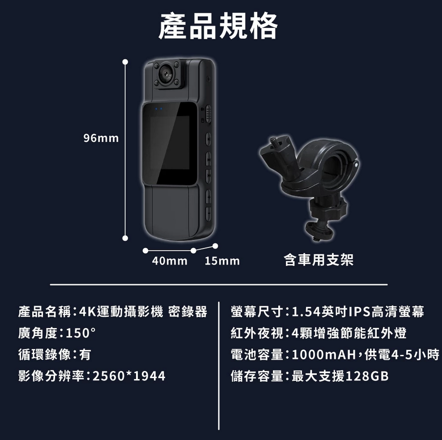 這款4K帶螢幕運動攝影機,讓您隨時隨地捕捉生活中的精彩瞬間。它不僅輕巧便攜,方便您在各種戶外活動中使用,還配備了高解析度的螢幕,讓您可以即時預覽和回放拍攝的內容,確保每一張照片和影片都清晰完美。內建的麥克風可以同步錄音,清晰地還原現場的聲音,讓您的影片更加生動。此外,它還支援紅外線夜視功能,即使在光線不足的環境下也能夠清晰拍攝。隨機附贈64GB記憶卡,讓您無需額外購買,開箱即可享受攝影的樂趣。