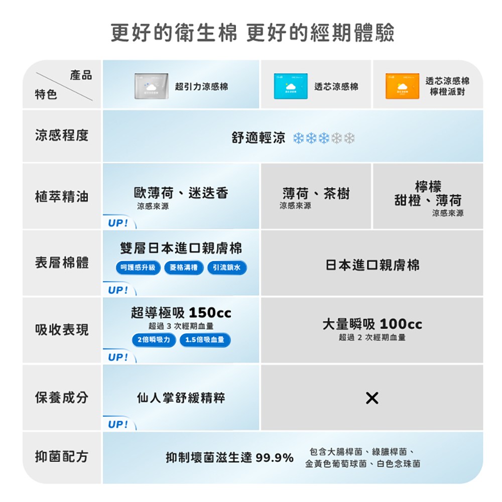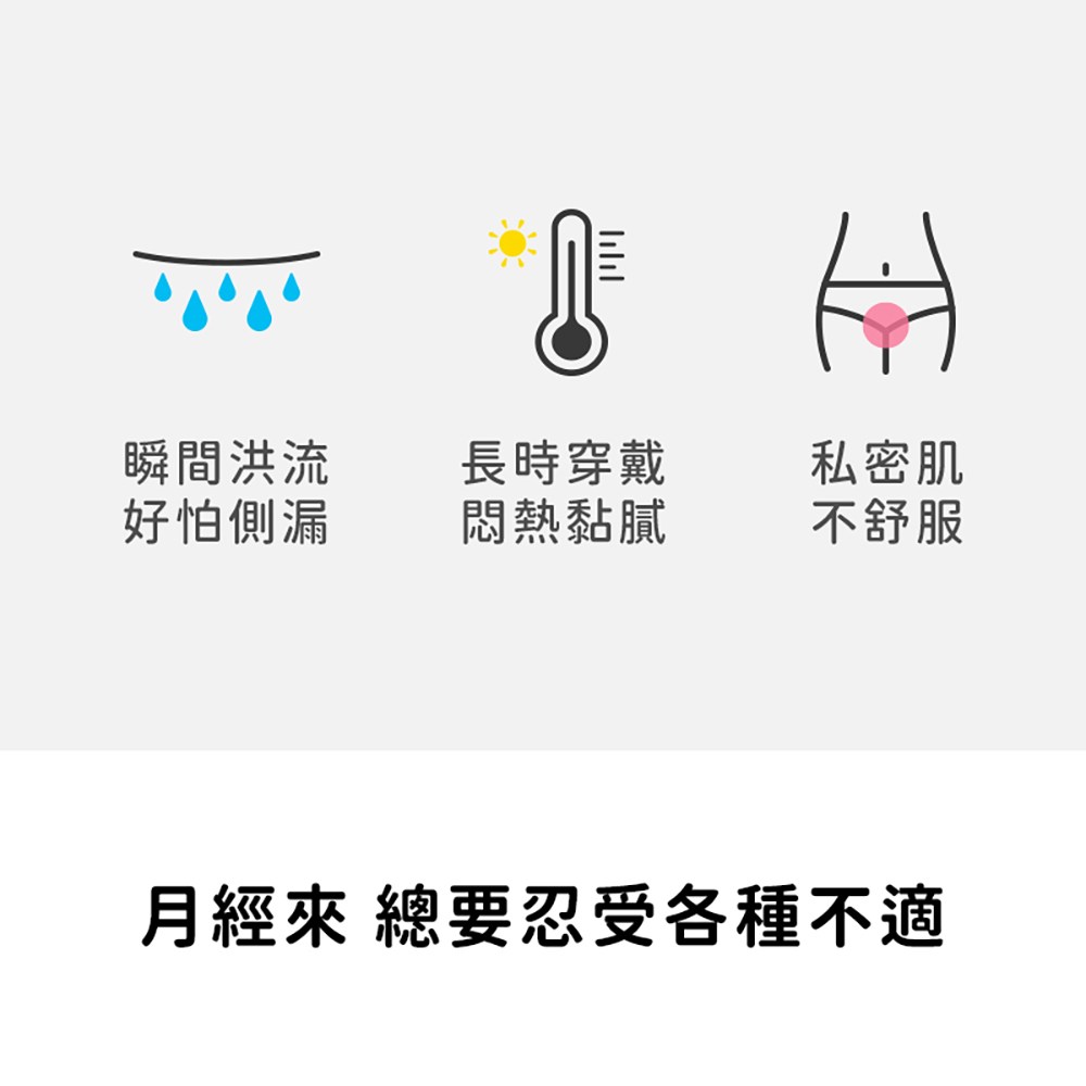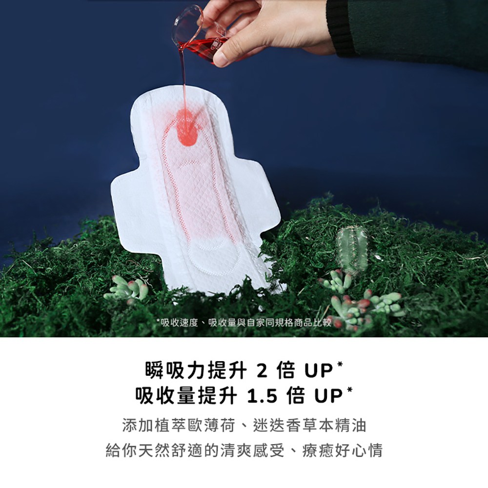 - 超引力涼感棉,瞬間吸收,告別悶熱不適,讓妳在經期也能感受清新舒爽,告別黏膩感。