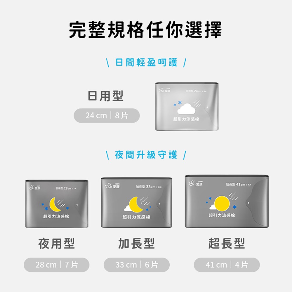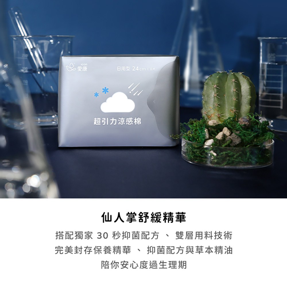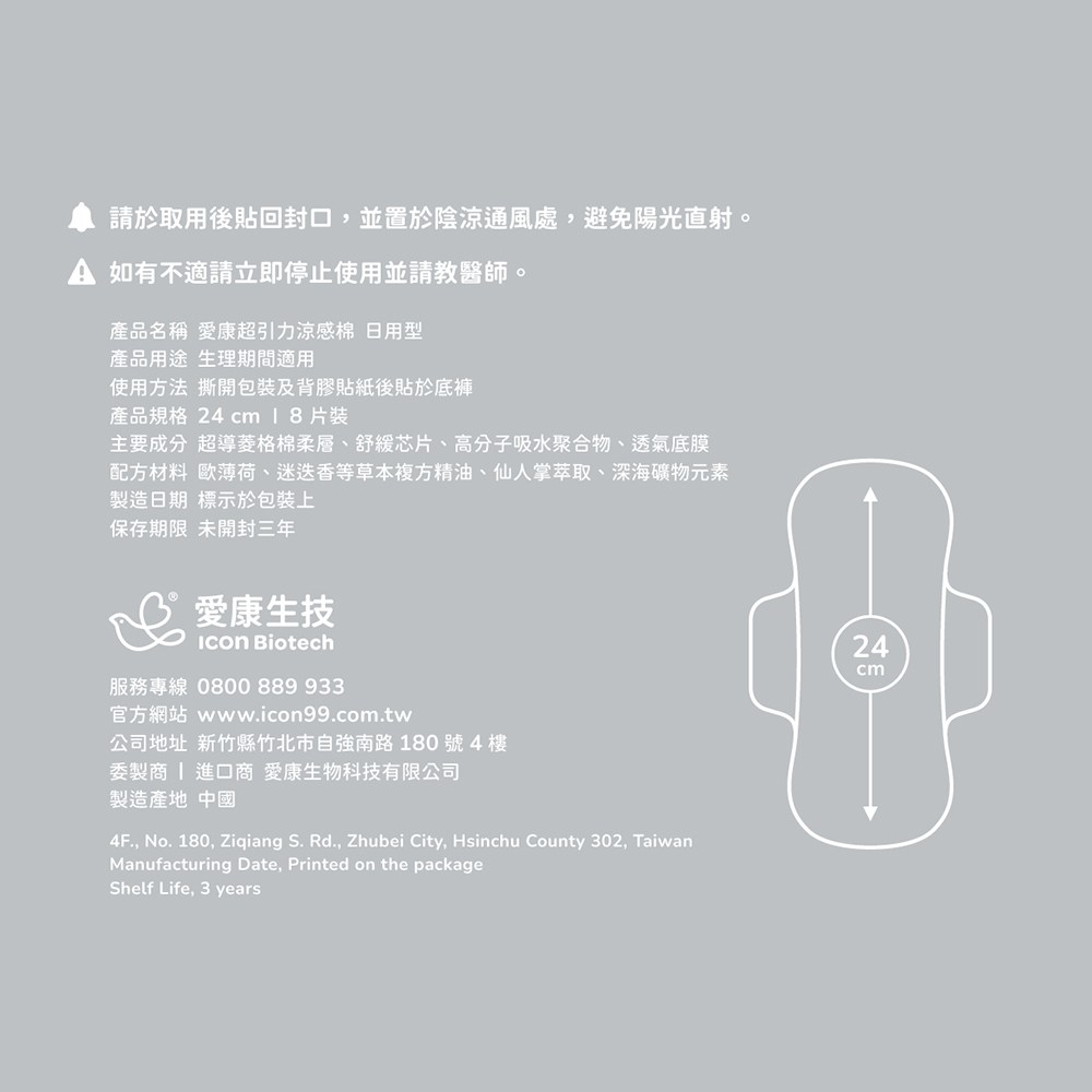 - 愛康獨家涼感配方,舒緩經期不適,帶來輕柔涼感,讓妳在特殊時期也能擁有好心情。