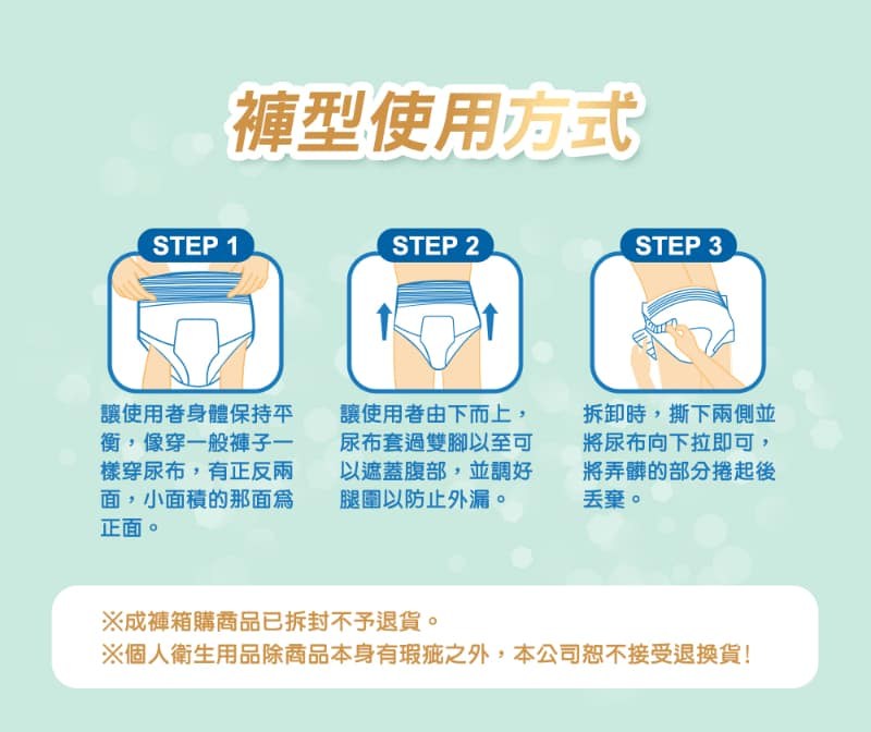 - 褲型設計穿脫容易,就像內褲一樣方便,活動自如無束縛感,輕鬆享受生活。