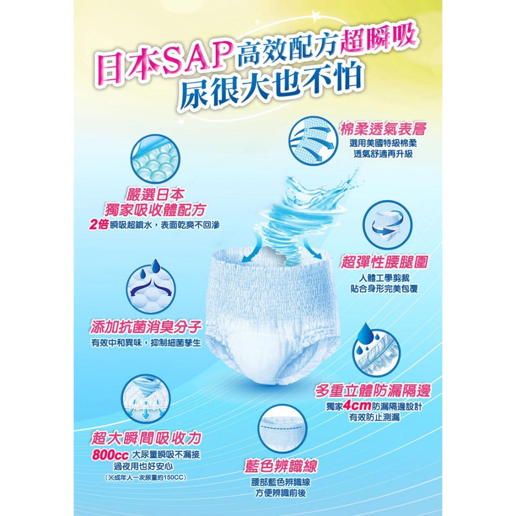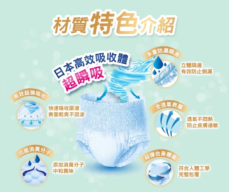 - 超強吸收體瞬間吸收尿液,保持乾爽舒適,減少異味困擾,給您清新體驗。