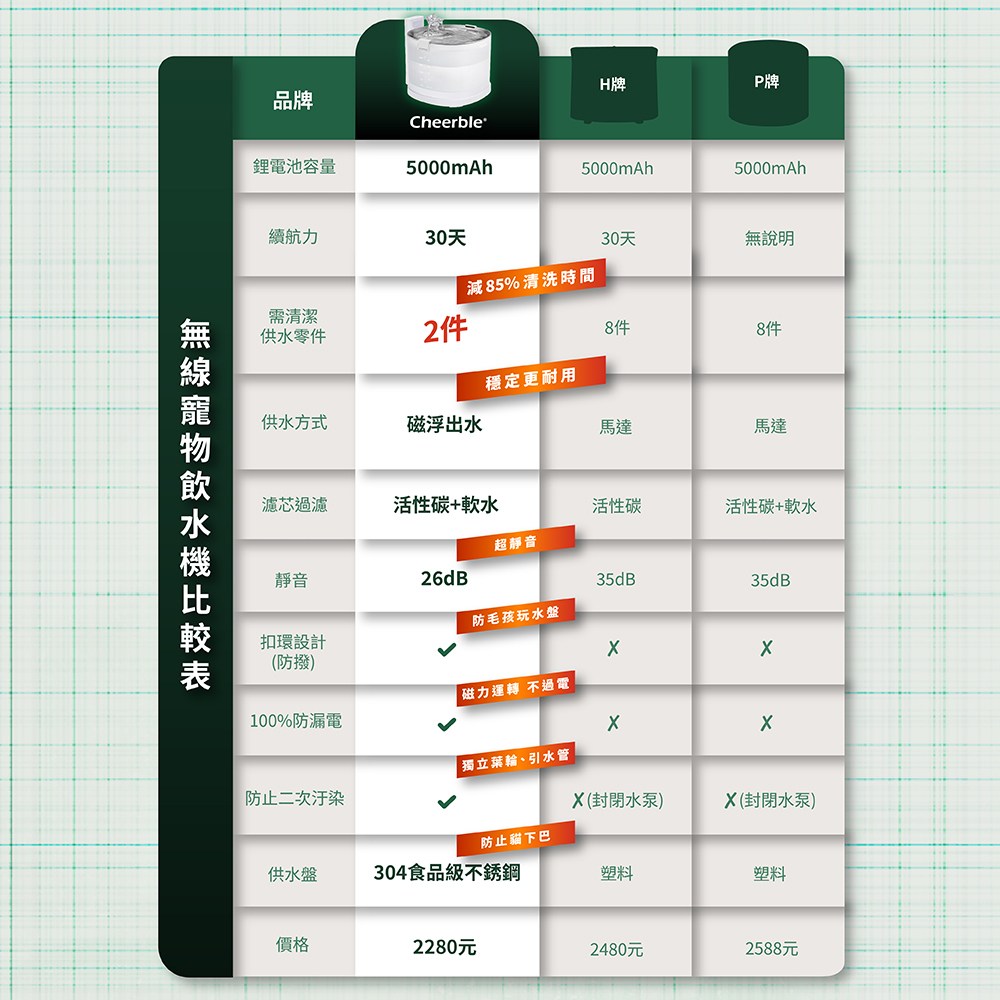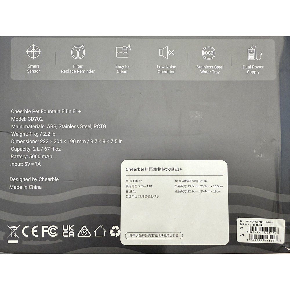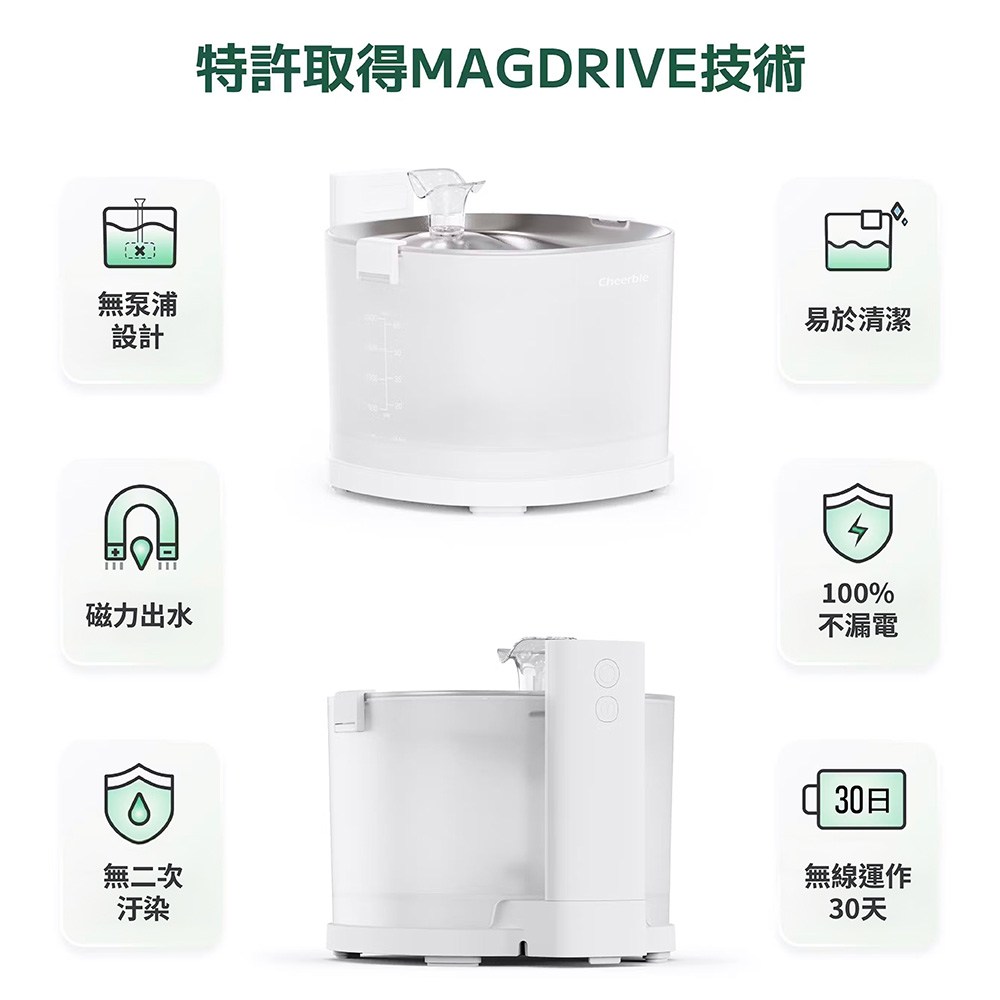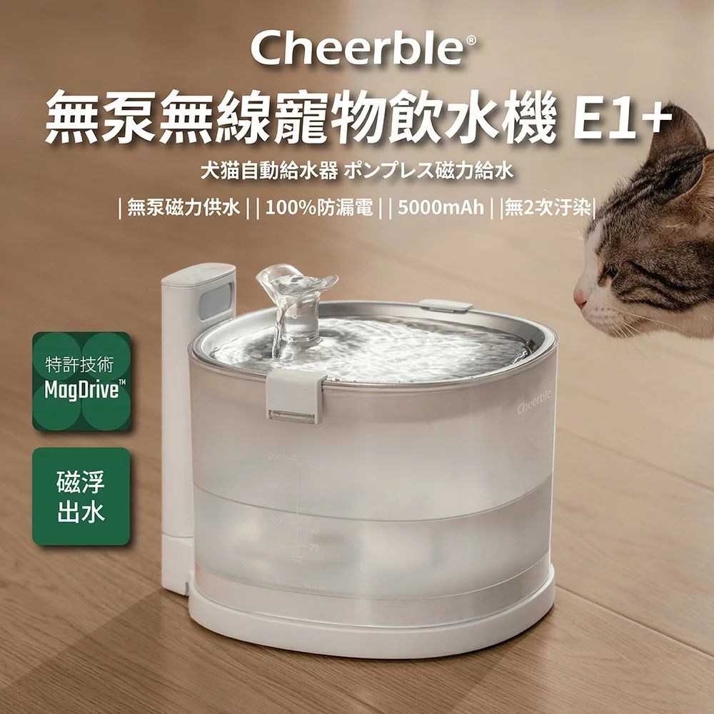 CHEERBLE 無泵無線寵物飲水機 E1+,採用創新磁力供水技術,模擬自然湧泉,吸引寵物主動飲水,增加每日飲水量。無線設計擺脫電線束縛,使用更方便安全。大容量儲水設計,減少頻繁加水次數,即使短途外出也能確保寵物飲水無虞。低噪音運行,不打擾寵物與您的寧靜生活。簡約外觀設計,輕鬆融入居家風格,提升生活品味,讓您的愛寵隨時享受純淨、健康的飲水。