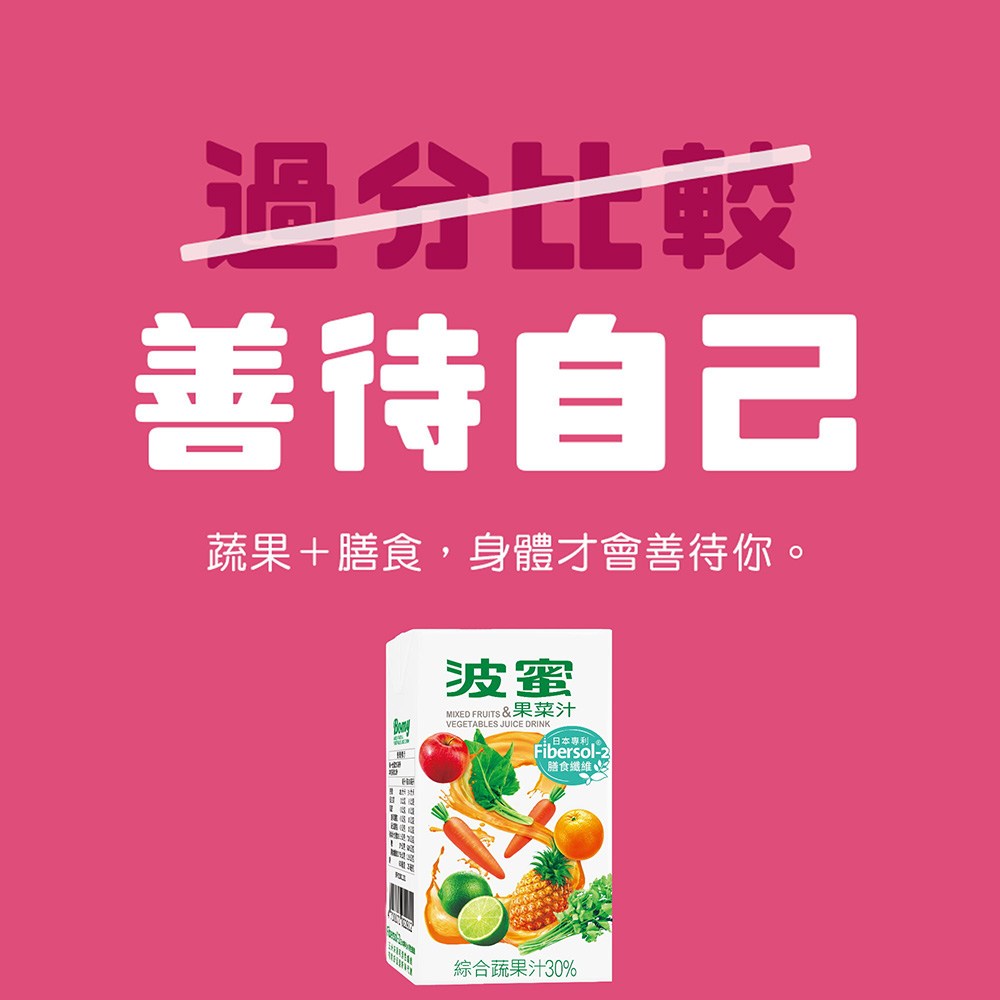 波蜜膳食纖維果菜汁是您健康生活的好夥伴。它結合多種蔬果的營養,提供豐富的膳食纖維,有助於促進腸道蠕動,幫助消化。這款果菜汁口感清爽,不含人工色素及防腐劑,讓您在享受美味的同時,也能喝得安心又健康。無論是早餐、午餐或下午茶,波蜜膳食纖維果菜汁都是您補充營養、維持健康的理想選擇。每天一瓶,讓您輕鬆擁有健康好氣色。