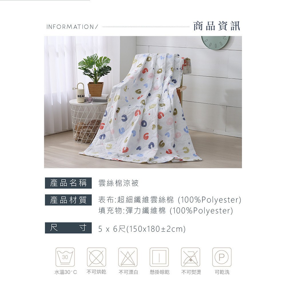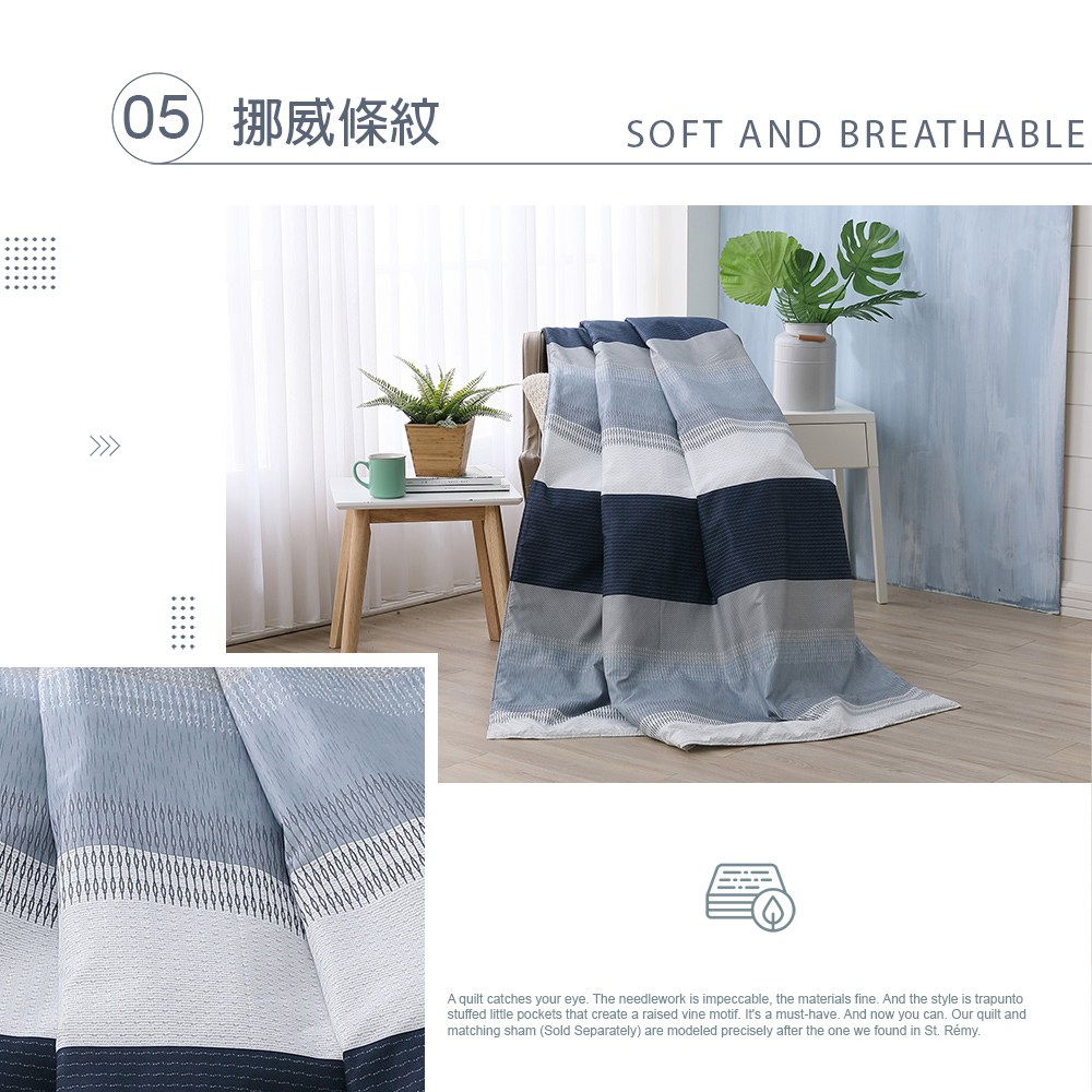 伊舒爾雲絲棉鋪棉涼被採用超細纖維雲絲棉表布與彈力纖維棉填充物,觸感柔軟親膚,透氣性佳,讓您在炎熱的夏夜也能享受舒適睡眠。獨特的雲絲棉材質,具有不易掉色、不易起毛的特性,經久耐用。精緻的挪威條紋設計,簡約時尚,為您的臥室增添一抹北歐風情。涼被尺寸為6 x 5尺,適合單人或雙人使用。可機洗設計,清潔方便,讓您輕鬆維持寢具的衛生。