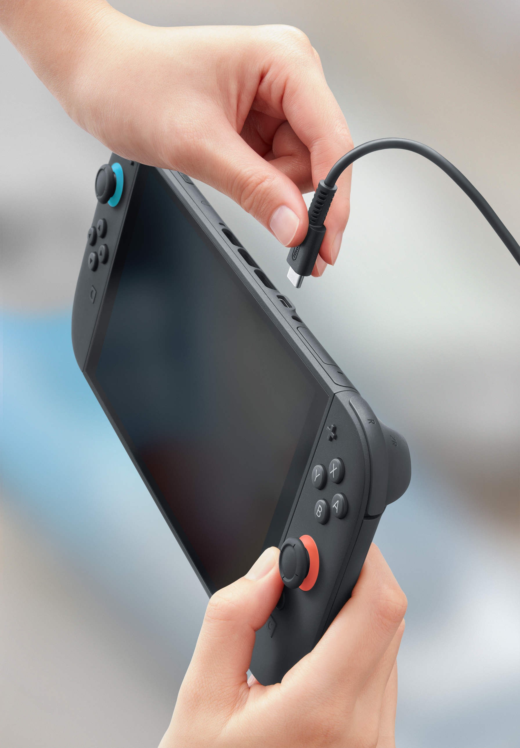 按下C鍵就能使用Nintendo Switch 2 的新功能――「遊戲聊天」。只靠一個按鍵,隨時都能在遊玩時輕松開始聊天。聊天時也可以分享正在遊玩的遊戲畫面。主機上方新增了USB Type-C®插孔,只要連接至隨付的電源供應器就能同時充電,長時間遊玩。除此之外也可以USB攝影機(另售)連接,享受「視訊通話」的樂趣。