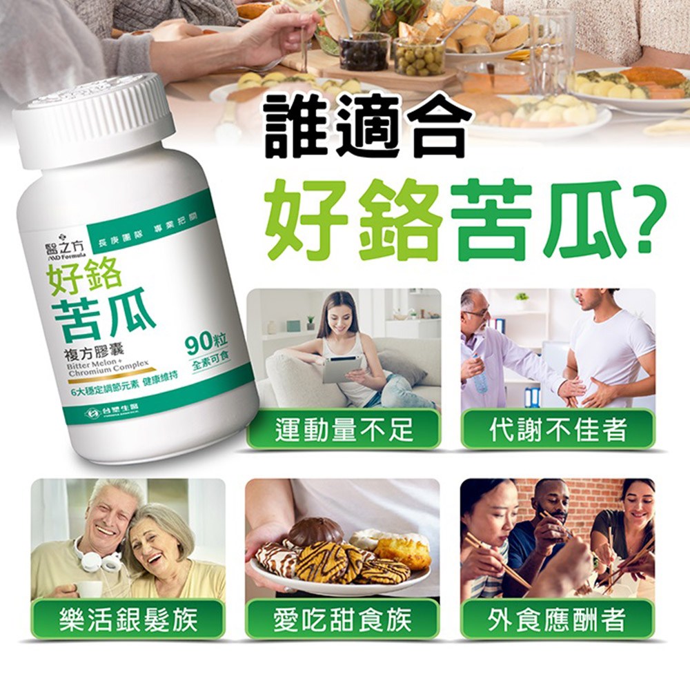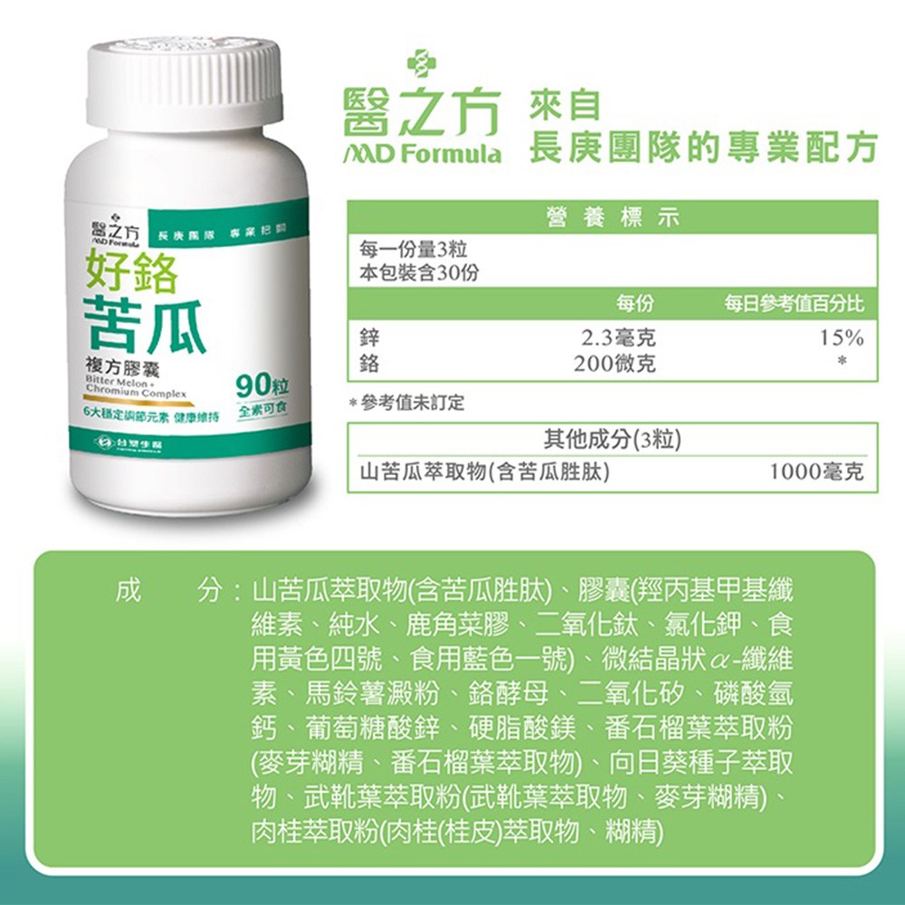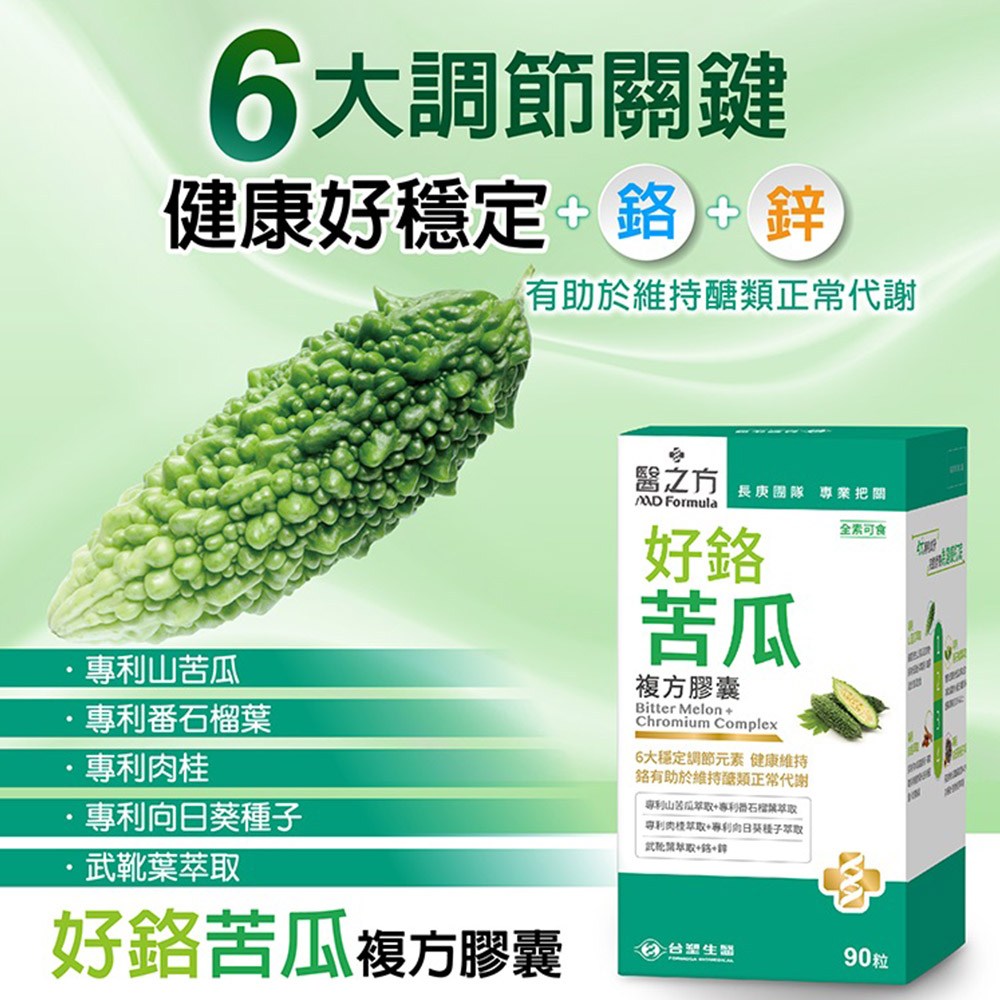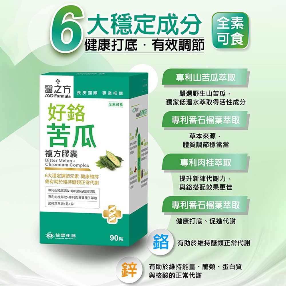 台塑生醫MD Formula醫之方好鉻苦瓜複方膠囊,由長庚團隊專業把關,結合六大穩定調節元素,全素可食。本產品採用專利山苦瓜萃取,搭配專利番石榴葉萃取、專利肉桂萃取及專利向日葵種子萃取,促進新陳代謝。添加鉻與鋅,為健康打底,維持能量正常代謝。適合運動量不足、代謝不佳、愛吃甜食及外食應酬者。