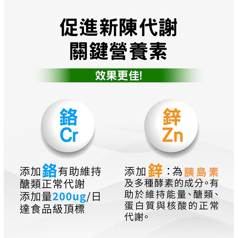 - 特別添加鉻與鋅,是維持健康的重要元素。