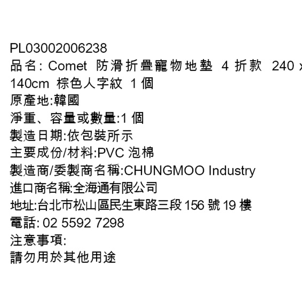 Comet防滑折疊寵物地墊採用棕色人字紋設計,外觀時尚且易於融入各種居家風格。這款地墊尺寸為240 x 140公分,提供足夠的空間讓寵物舒適地休息和玩耍。其防滑設計確保寵物在使用時不易滑動,增加安全性。折疊功能方便收納,不佔用過多空間。原產地為韓國,品質值得信賴,是您寵物居家生活的好選擇。