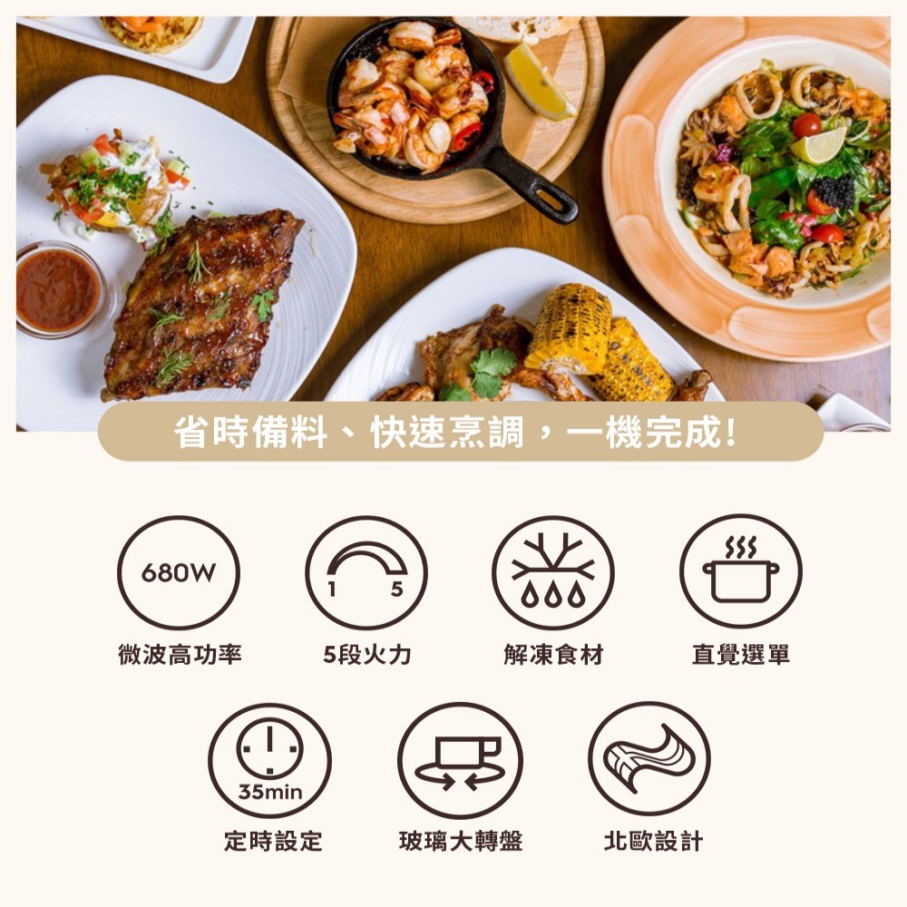 - 680W高功率微波,快速均勻加熱,讓食材迅速烹調,保留食材新鮮美味。