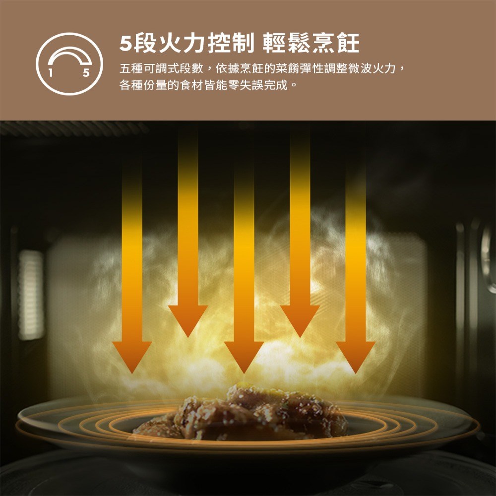 - 五段火力控制,輕鬆調整火力,無論解凍、加熱或烹飪,都能精準掌握。