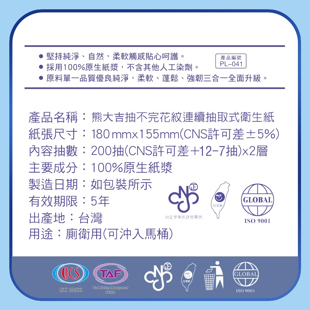 熊大吉抽不完衛生紙,給您最安心的呵護。無添加螢光劑與香精,溫和不刺激,全家大小都適用。每包含有250張抽取式面紙,雙層設計,柔軟又不易破。
