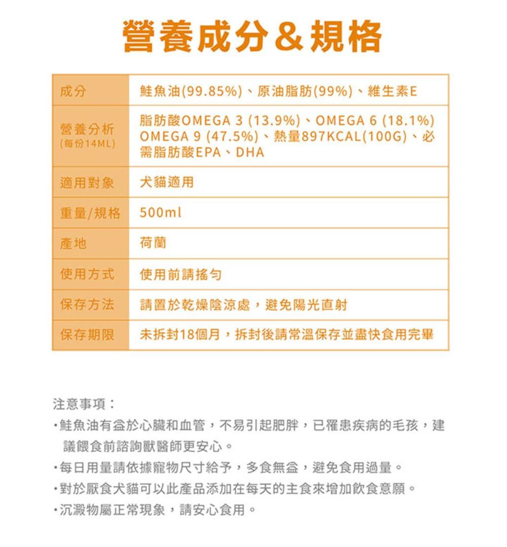 袋鼠廚房100%挪威鮭魚油,為您的愛犬和愛貓提供全方位的營養補充。這款鮭魚油富含Omega-3、Omega-6和Omega-9脂肪酸,有助於改善毛髮健康,減少皮膚問題,讓寵物擁有柔亮光澤的毛髮。同時,它也能增強寵物的免疫力,保護關節,促進心血管健康。本產品適口性極佳,即使是挑食的寵物也能輕鬆接受,讓您輕鬆為牠們補充每日所需的營養。使用前請搖勻,並按照寵物體重給予適當的餵食量。