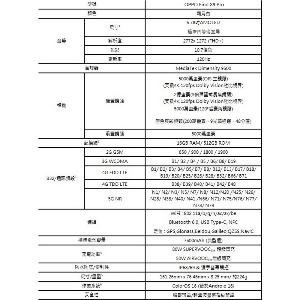 OPPO Find X9 Pro 霜月白是一款兼具時尚外觀與強大性能的智慧型手機。其優雅的霜月白配色,展現出獨特的品味與風格。512GB大容量儲存空間,讓您無需擔心容量不足的問題,盡情存放珍貴的照片、影片與應用程式。頂級處理器提供卓越的效能,無論是暢玩遊戲、觀看影片或多工處理,都能享受流暢的操作體驗。哈蘇專業相機,讓您輕鬆捕捉生活中的每個精彩瞬間,記錄美好回憶。