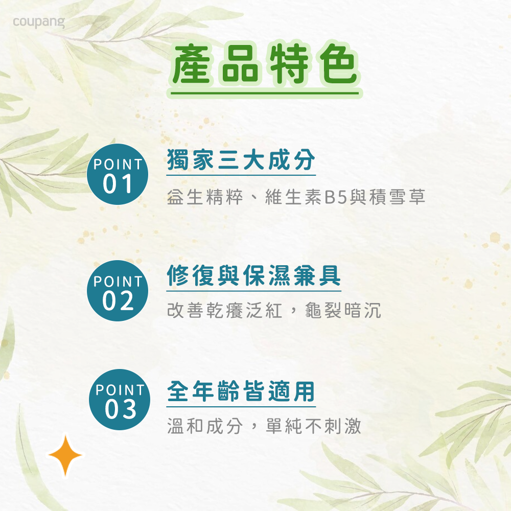 - 添加維生素B5與積雪草,能有效修復肌膚,改善乾燥、泛紅等問題,使肌膚恢復健康光澤。