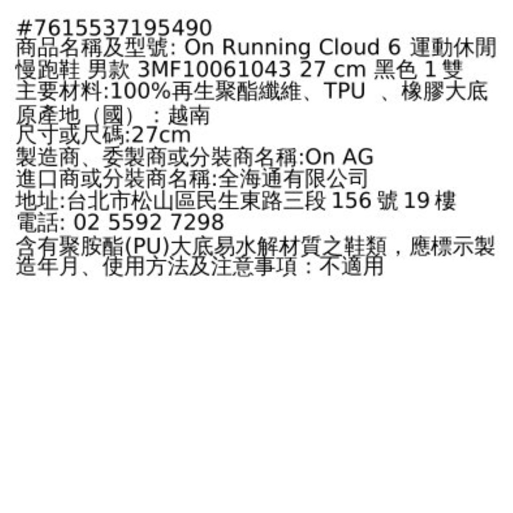 On 昂跑 男款 Running Cloud 6 運動休閒慢跑鞋 3MF10061043