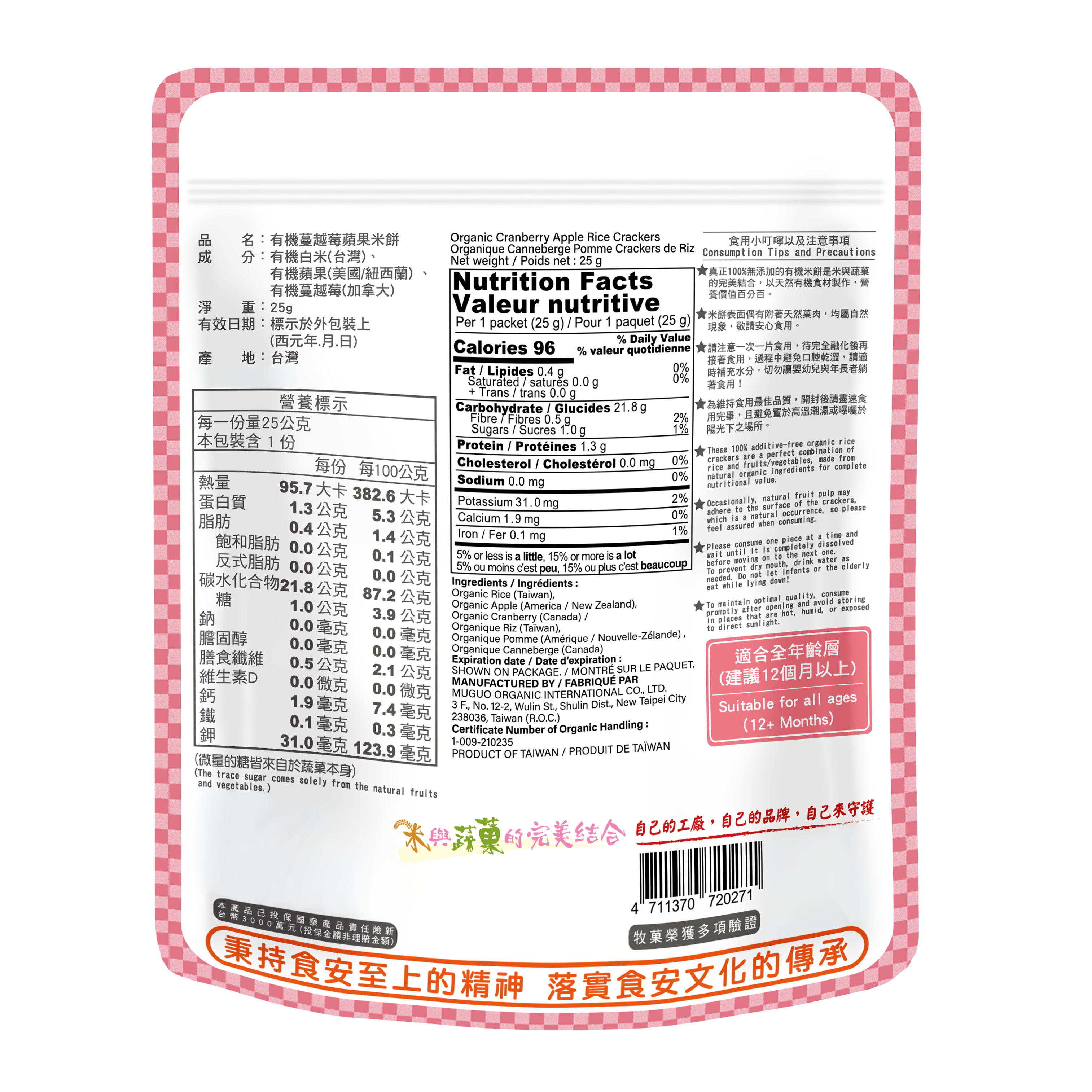 寶寶的秘密米餅,蔓越莓+蘋果口味,是專為12個月以上寶寶設計的健康零食,無添加糖、鹽、油。每包含有獨立包裝的25克米餅,方便攜帶和控制食用量。米餅口感酥脆,入口即化,適合寶寶練習咀嚼和吞嚥,媽媽可以安心選擇。